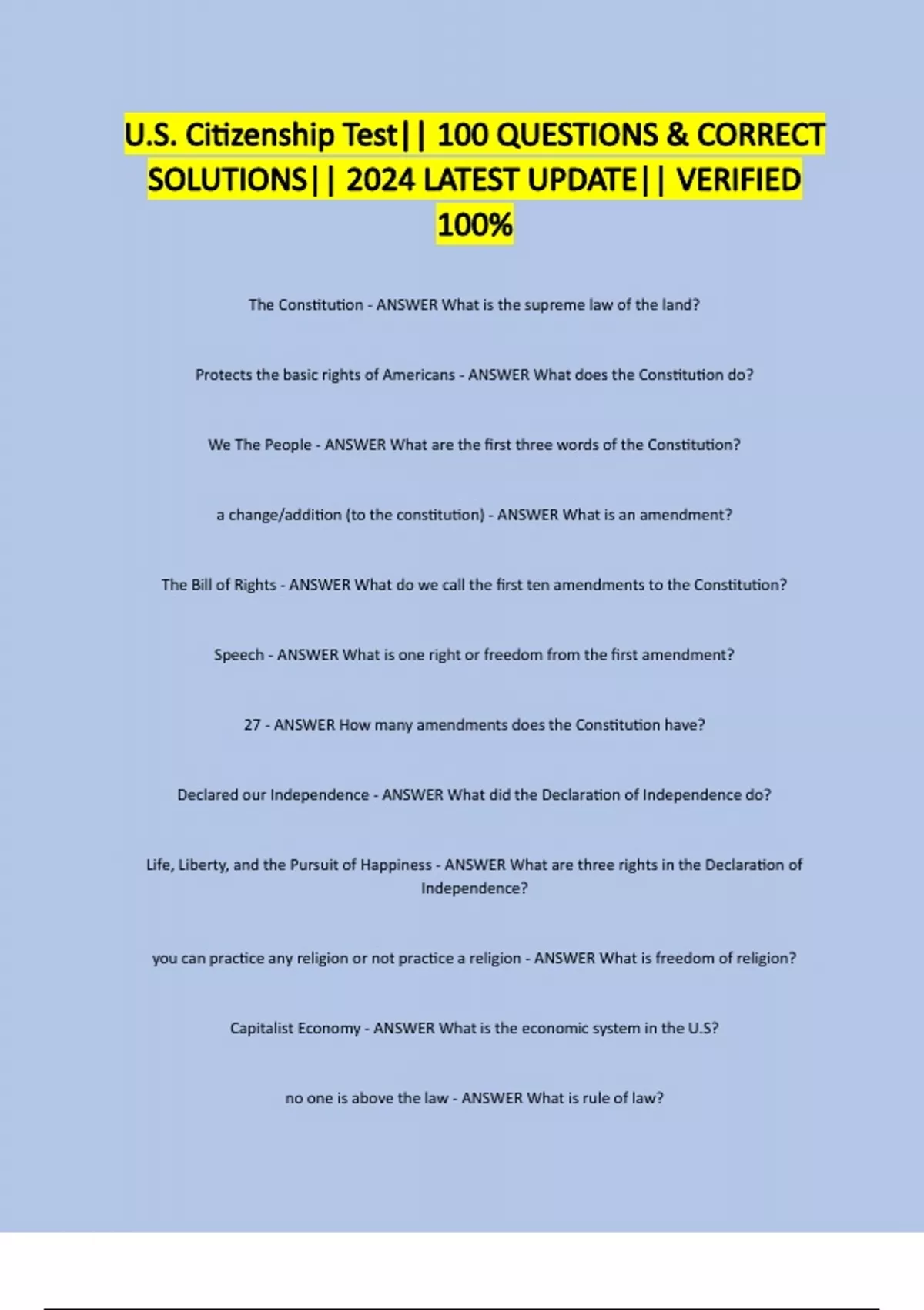 U.S. Citizenship Test|| 100 QUESTIONS & CORRECT SOLUTIONS|| 2024 LATEST UPDATE|| VERIFIED 100%