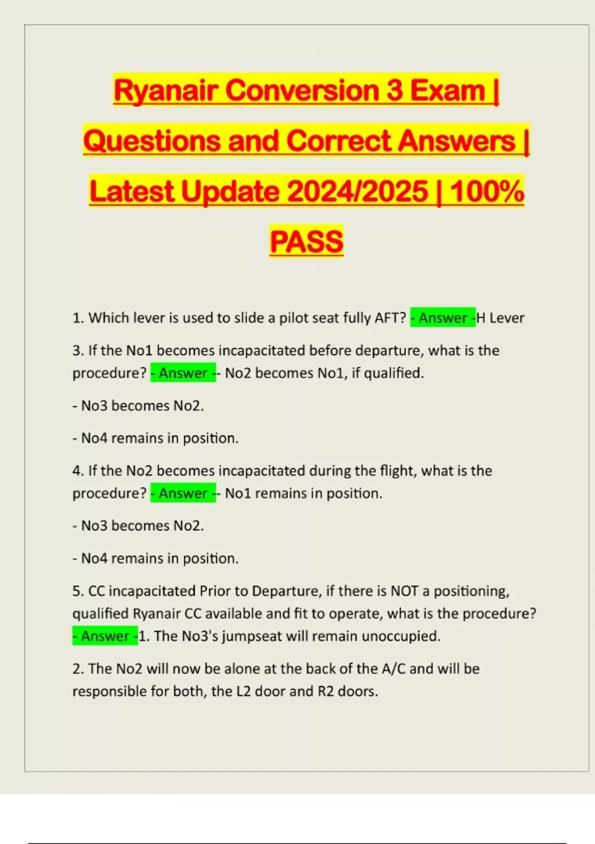 Ryanair Conversion 3 Exam | Questions and Correct Answers | Latest Update 2024/2025 | 100% PASS 1. Which lever is used to slide a pilot seat fully AFT? - Answer -H Lever 3. If the No1 becomes incapacitated before departure, what is the procedure? - Answer -- No2 becomes No1, if qualified. - No3 becomes No2. - No4 remains in position. 4. If the No2 becomes incapacitated during the flight, what is the procedure? - Answer -- No1 remains in position. - No3 becomes No2. - No4 remains in position. 5. CC incapacitated Prior to Departure, if there is NOT a positioning, qualified Ryanair CC available and fit to operate, what is the procedure? - Answer -1. The No3's jumpseat will remain unoccupied. 2. The No2 will now be alone at the back of the A/C and will be responsible for both, the L2 door and R2 doors.3. It will normally be necessary to brief an ABP for the R2 door in routine circumstances, however in an emergency situation, ABP's shall be selected and briefed as per procedures outlined in section 4 oaths manual. 4. The assigned No2 shall be responsible for both No2 and No3 duties under normal and emergency situation. 5. When conducting the safety demonstration with 3 CC the No1 shallowing verbally do the safety demostration PA. The remaining CC shall conduct the safety demonstration in rows