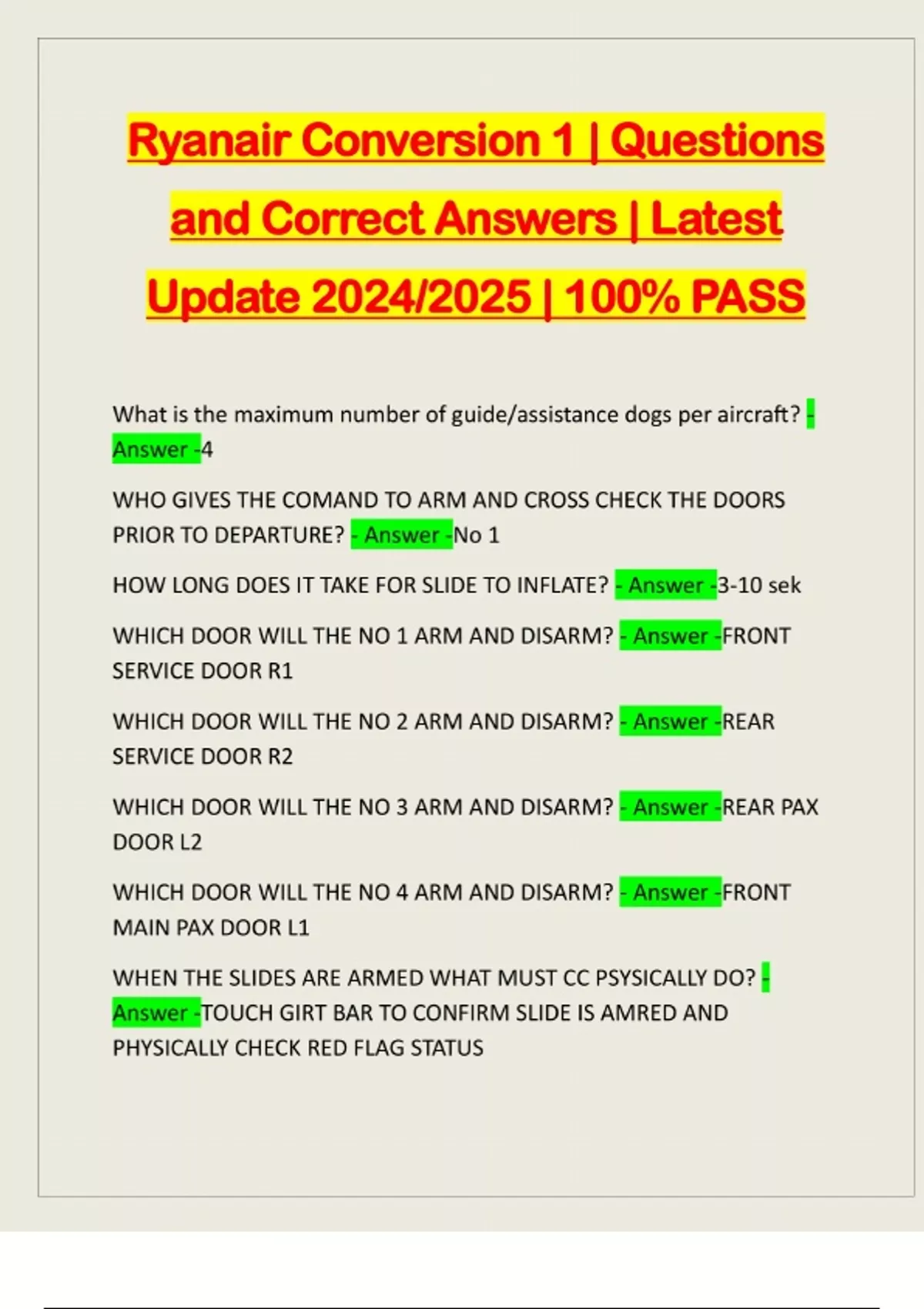 Ryanair Conversion 1 | Questions and Correct Answers | Latest Update 2024/2025 | 100% PASS What is the maximum number of guide/assistance dogs per aircraft? - Answer -4 WHO GIVES THE COMAND TO ARM AND CROSS CHECK THE DOORS PRIOR TO DEPARTURE? - Answer -No 1 HOW LONG DOES IT TAKE FOR SLIDE TO INFLATE? - Answer -3-10 sek WHICH DOOR WILL THE NO 1 ARM AND DISARM? - Answer -FRONT SERVICE DOOR R1 WHICH DOOR WILL THE NO 2 ARM AND DISARM? - Answer -REAR SERVICE DOOR R2 WHICH DOOR WILL THE NO 3 ARM AND DISARM? - Answer -REAR PAX DOOR L2 WHICH DOOR WILL THE NO 4 ARM AND DISARM? - Answer -FRONT MAIN PAX DOOR L1 WHEN THE SLIDES ARE ARMED WHAT MUST CC PSYSICALLY DO? - Answer -TOUCH GIRT BAR TO CONFIRM SLIDE IS AMRED AND PHYSICALLY CHECK RED FLAG STATUSWHAT IS THE CORRECT PROCEDURE TO OPEN A DOOR FROM OUTSIDE WHEN MOBILE STEPS ARE IN PLACE? - Answer -ONLY QUALIFFICATED STAFF 1. PULL THE HANDLE OUT.