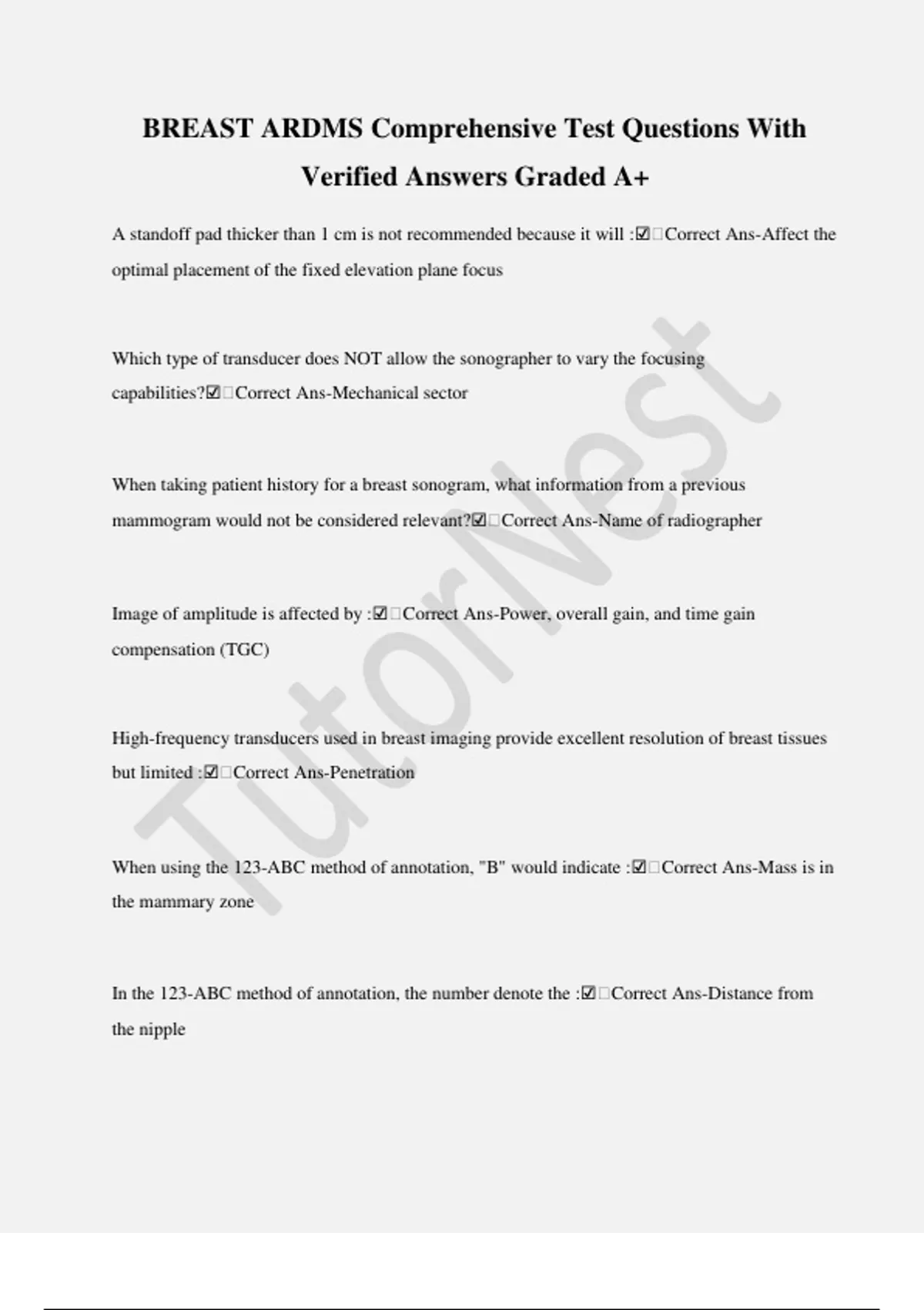 BREAST ARDMS Comprehensive Test Questions With Verified Answers Graded A+