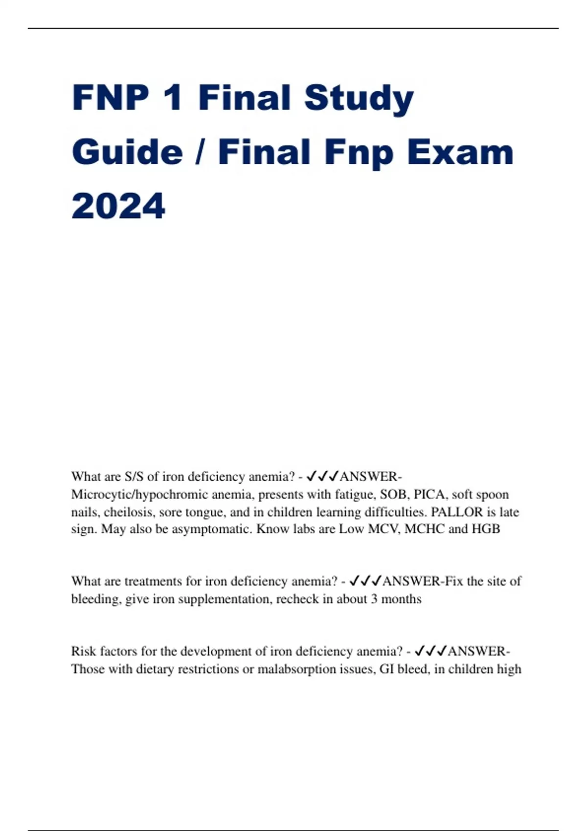 FNP 1 Final Study Guide / Final Fnp Exam 2024 What are S/S of iron deficiency anemia? - ANSWER-Microcytic/hypochromic anemia, presents with fatigue, SOB, PICA, soft spoon nails, cheilosis, sore tongue, and in children learning difficulties. PALLOR is late sign. May also be asymptomatic. Know labs are Low MCV, MCHC and HGB What are treatments for iron deficiency anemia? - ANSWER-Fix the site of bleeding, give iron supplementation, recheck in about 3 months Risk factors for the development of iron deficiency anemia? - ANSWER-Those with dietary restrictions or malabsorption issues, GI bleed, in children high