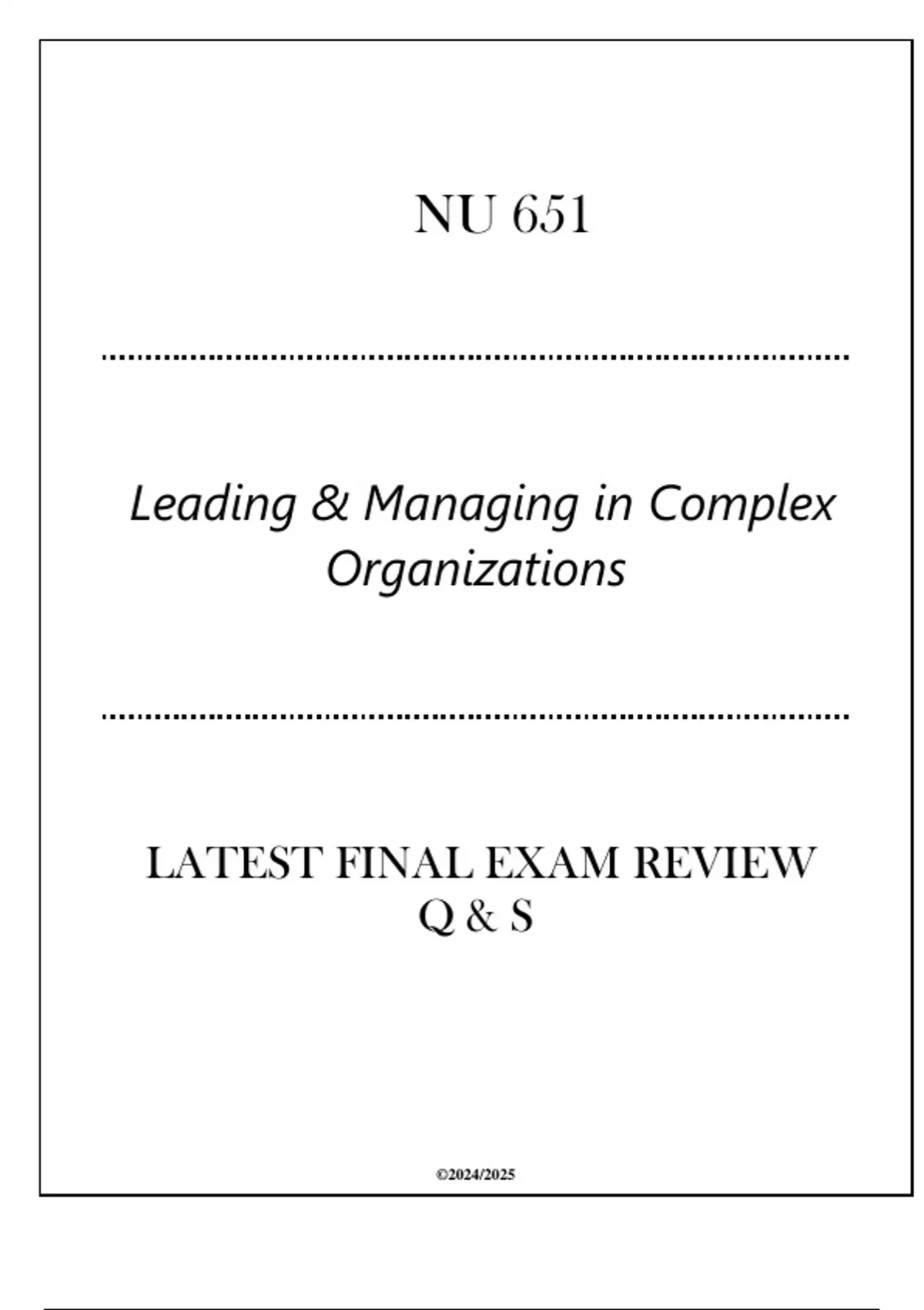 (HU) NU 651 Leading & Managing in Complex Organizations - Latest Final Exam Review Q & S(HU) NU 651 Leading & Managing in Complex Organizations - Latest Final Exam Review Q & S