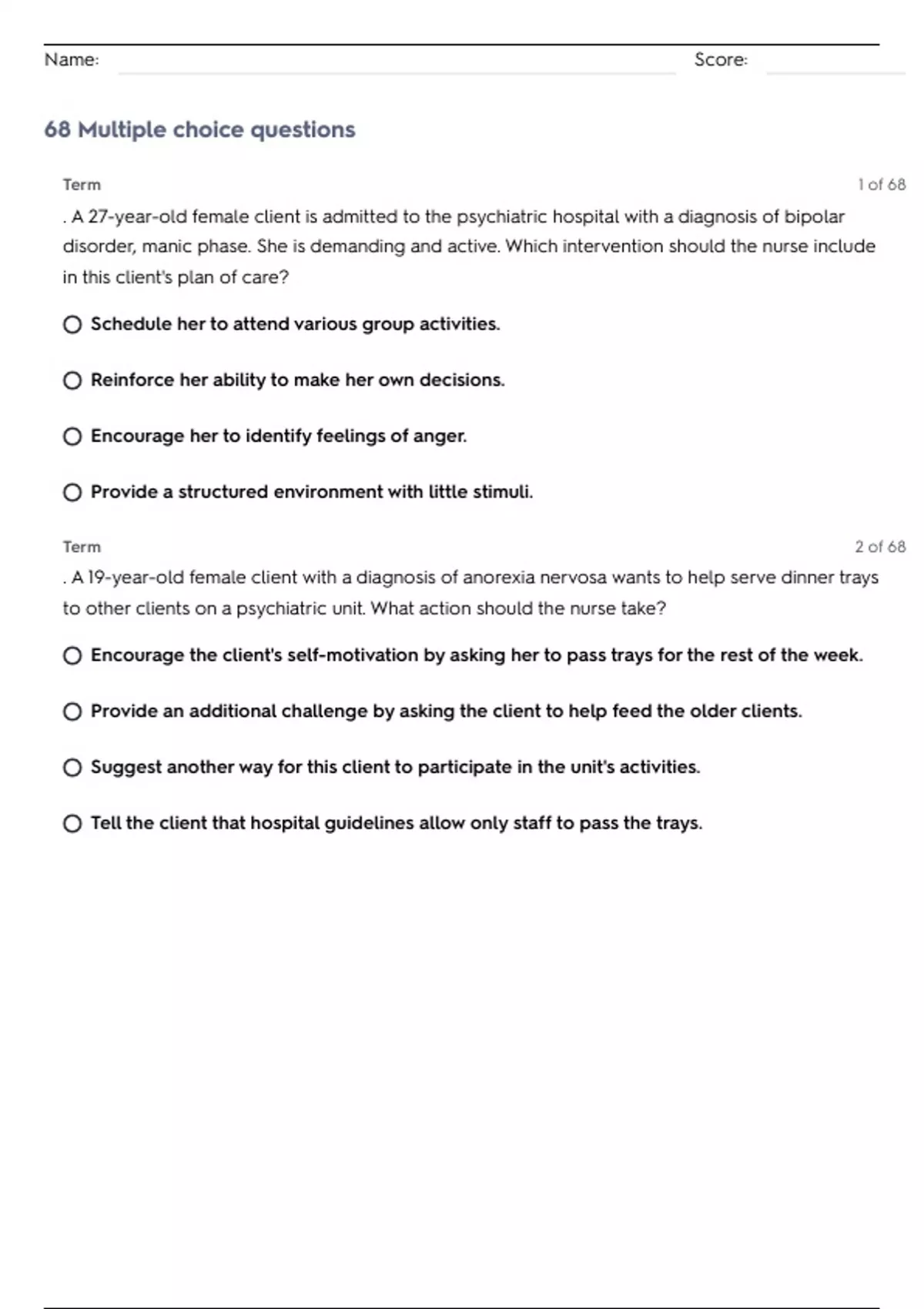 disorder, manic phase. She is demanding and active. Which intervention should the nurse include