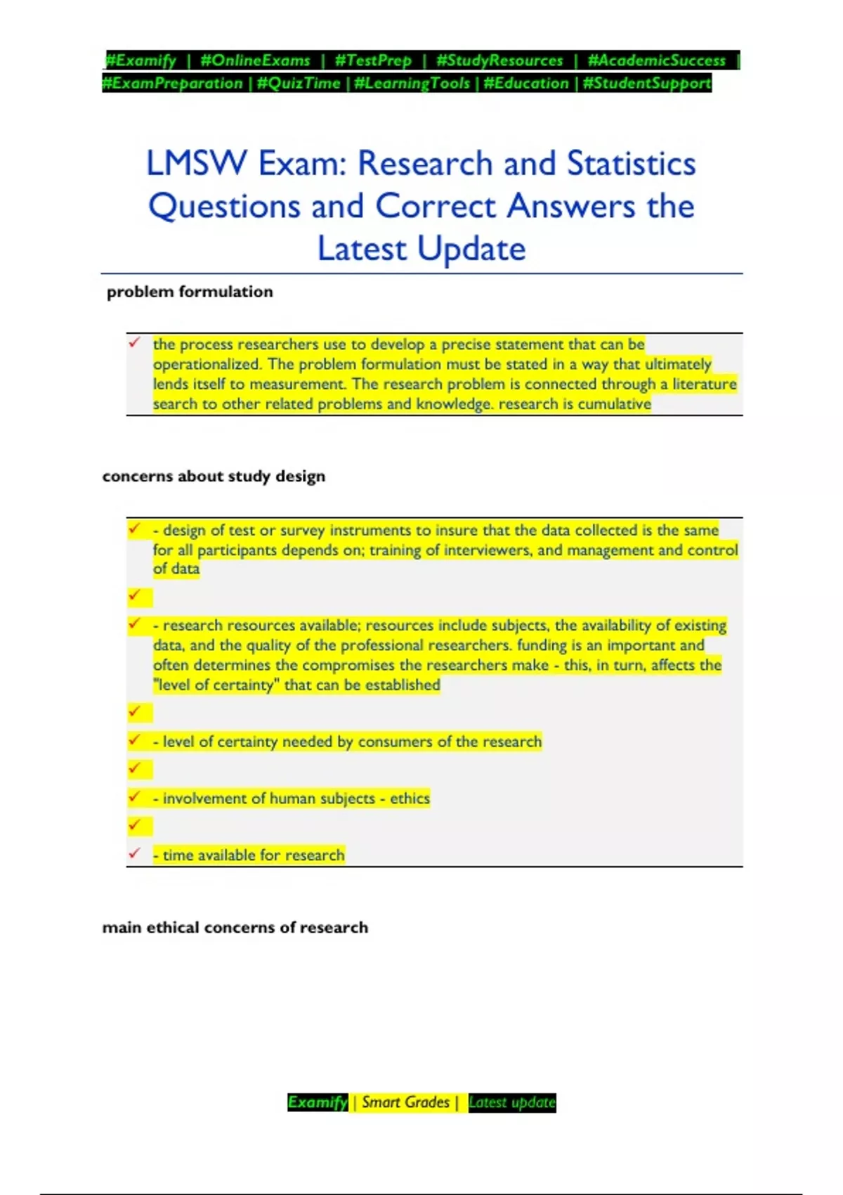 problem formulation the process researchers use to develop a precise statement that can be operationalized. The problem formulation must be stated in a way that ultimately lends itself to measurement. The research problem is connected through a literature search to other related problems and knowledge. research is cumulative concerns about study design - design of test or survey instruments to insure that the data collected is the same for all participants depends on; training of interviewers, and management and control of data - research resources available; resources include subjects, the availability of existing data, and the quality of the professional researchers. funding is an important and often determines the compromises the researchers make - this, in turn, affects the "level of certainty" that can be established - level of certainty needed by consumers of the research - involvement of human subjects - ethics - time available for research main ethical concerns of research #Examify | #OnlineExams | #TestPrep | #StudyResources | #AcademicSuccess | #ExamPreparation | #QuizTime | #LearningTools | #Education | #StudentSupport Examify | Smart Grades | Latest update research cannot lead to harming clients denial of an intervention may constitute harm informed consent confidentiality intervening and extraneous variable mediating variable it modifies or confounds the variation of the dependent variable, which was thought to results from the effects of the independent variable exploratory studies used to explore an area of knowledge where little is known and to gain familiarity with real life settings, problems, or phenomena used to clarify concepts and to develop hypotheses for subsequent research while used to explore new areas, they are built on careful assessment of knowledge that already exists - may include a systematic review of related literature descriptive studies concerned with ascertaining facts and are carefully designed studies of phenomena they attempt to develop an accurate qualitative and/or quantitative summary or systematic and well-defined sample is carefully constructed to avoid bias may be used to describe the characteristics of a population experimental studies #Examify | #OnlineExams | #TestPrep | #StudyResources | #AcademicSuccess | #ExamPreparation | #QuizTime | #LearningTools | #Education | #StudentSupport Examify | Smart Grades | Latest update the most rigorous of all studies always involve testing a prediction by manipulating an independent variable and measuring the effect on a dependent variable - purpose is to test for causality To determine causality, one must show Concomitant variation - that manipulation of the independent variable is associated with the changes in the dependent variable Time Factor/chronology - independent variable precedes the change in dependent variable Alternate operating variables - refer to observed changes caused by extraneous or unknown variables *the relationship cannot be explained by another variable Threats to internal and external validity history/ historical events maturatio