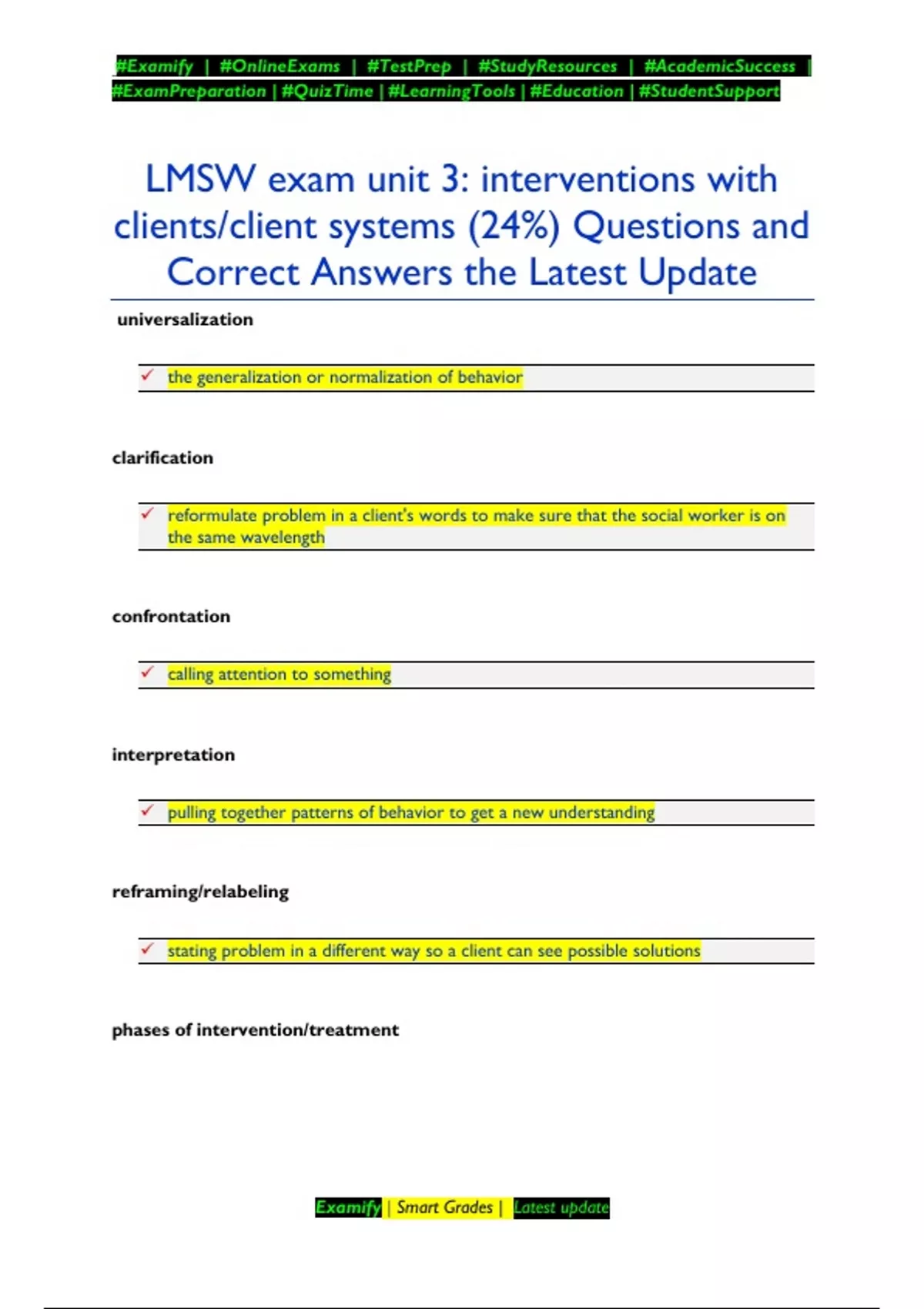 universalization the generalization or normalization of behavior clarification reformulate problem in a client's words to make sure that the social worker is on the same wavelength confrontation calling attention to something interpretation pulling together patterns of behavior to get a new understanding reframing/relabeling stating problem in a different way so a client can see possible solutions phases of intervention/treatment #Examify | #OnlineExams | #TestPrep | #StudyResources | #AcademicSuccess | #ExamPreparation | #QuizTime | #LearningTools | #Education | #StudentSupport Examify | Smart Grades | Latest update Engagement with client, Assessment of strengths and needs, Planning intervention Intervention Evaluation of efforts Termination and anticipation of future needs *also called the problem solving approach stages of change precontemplation, contemplation, preparation, action, maintenance, relapse preparation stage of change experimenting with small changes, collecting information about change complete participant living the experience as a participant participant as observer interacting with those who are participating observer as participant limited relationship with others participating - primarily an observer complete observer removed from activity, observer only active listening #Examify | #OnlineExams | #TestPrep | #StudyResources | #AcademicSuccess | #ExamPreparation | #QuizTime | #LearningTools | #Education | #StudentSupport Examify | Smart Grades | Latest update social workers are sitting up straight, leaning towards client in relaxed/open manner can include commenting on client's statements, asking open-ended q's, making statements that show listening is occurring use of silence shows acceptance of client's feelings, promotes introspection or time to think about what has been learned *very effective when used with client who is displaying a high degree of emotion questioning using open and closed ended formats to get relevant information in a nonjudgmental manner reflecting or validating show empathetic understanding of clients' problems. Can assist clients in understanding negative thought patterns paraphrasing and clarifying rephrase what the client is saying in order to join together information. Uses questioning, paraphrasing, and restating to ensure full understanding of clients' ideas and thoughts reframing shows cli