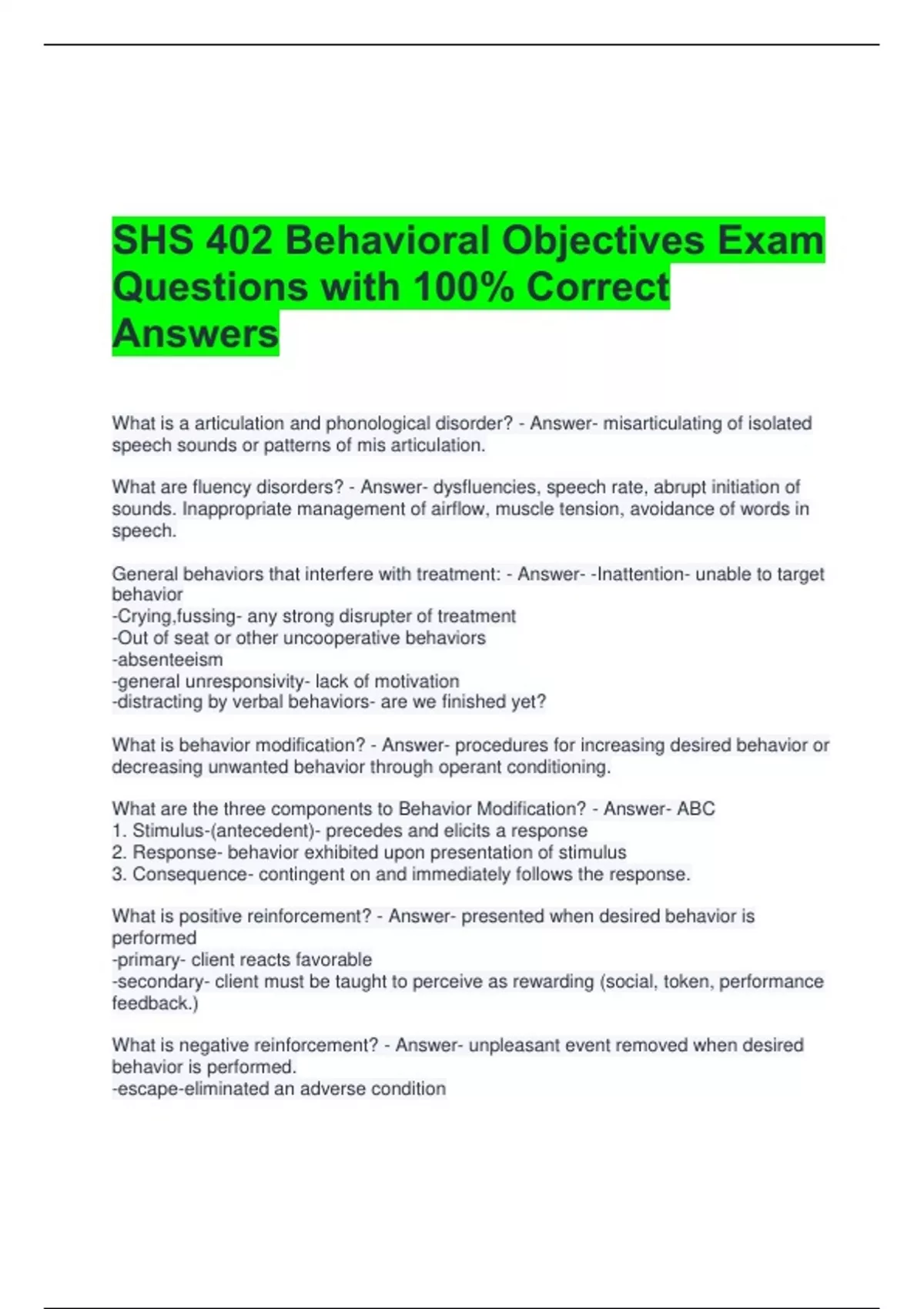 SHS 402 Behavioral Objectives Exam Questions with 100% Correct Answers What is a articulation and phonological disorder? - Answer- misarticulating of isolated speech sounds or patterns of mis articulation. What are fluency disorders? - Answer- dysfluencies, speech rate, abrupt initiation of sounds. Inappropriate management of airflow, muscle tension, avoidance of words in speech. General behaviors that interfere with treatment: - Answer- -Inattention- unable to target behavior -Crying,fussing- any strong disrupter of treatment -Out of seat or other uncooperative behaviors -absenteeism -general unresponsivity- lack of motivation -distracting by verbal behaviors- are we finished yet? What is behavior modification? - Answer- procedures for increasing desired behavior or decreasing unwanted behavior through operant conditioning. What are the three components to Behavior Modification? - Answer- ABC 1. Stimulus-(antecedent)- precedes and elicits a response 2. Response- behavior exhibited upon presentation of stimulus 3. Consequence- contingent on and immediately follows the response. What is positive reinforcement? - Answer- presented when desired behavior is performed -primary- client reacts favorable -secondary- client must be taught to perceive as rewarding (social, token, performance feedback.) What is negative reinforcement? - Answer- unpleasant event removed when desired behavior is performed. -escape-eliminated an adverse condition -avoidance-prevents the occurense of anticipated aversive condition What is punishment or Corrective Feedback? - Answer- presented contingent on the performance of an undesired behavior. -aversive consequence after each desired behavior -withdrawal of pleasant condition ex. time out