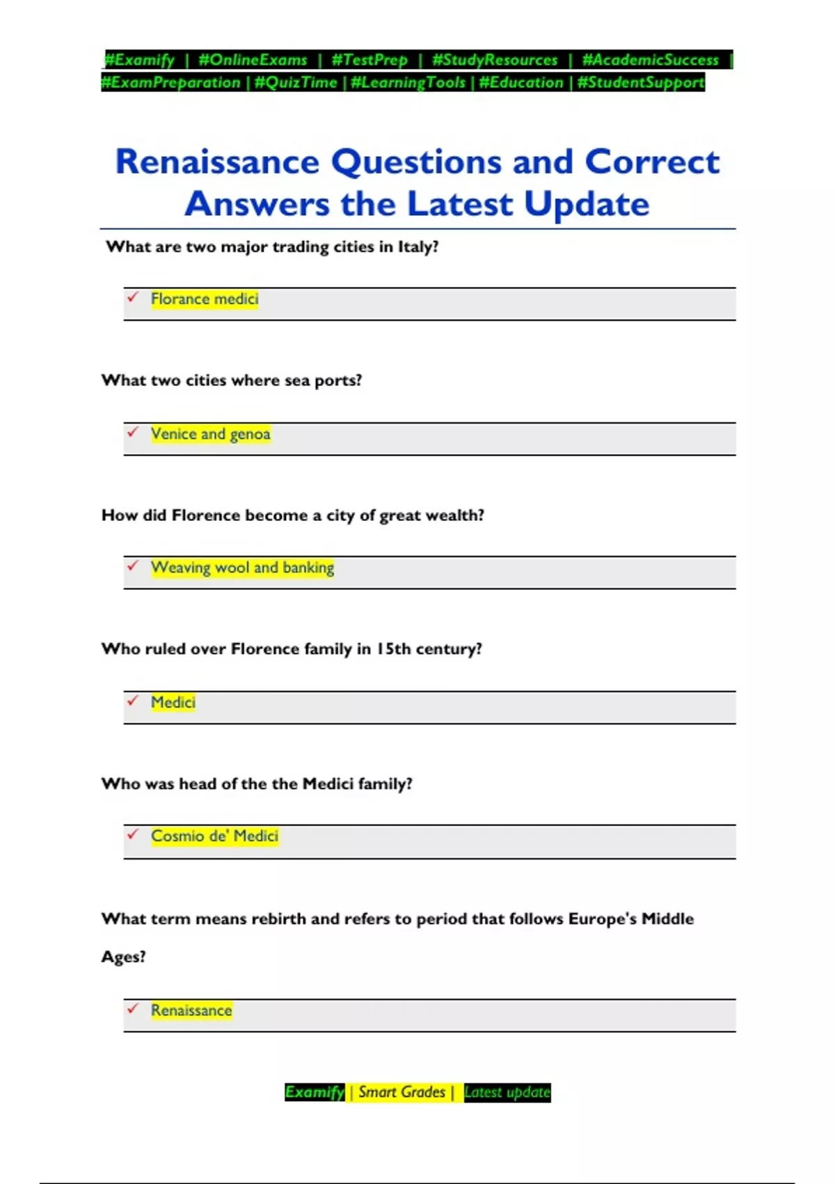 Renaissance Questions and Correct