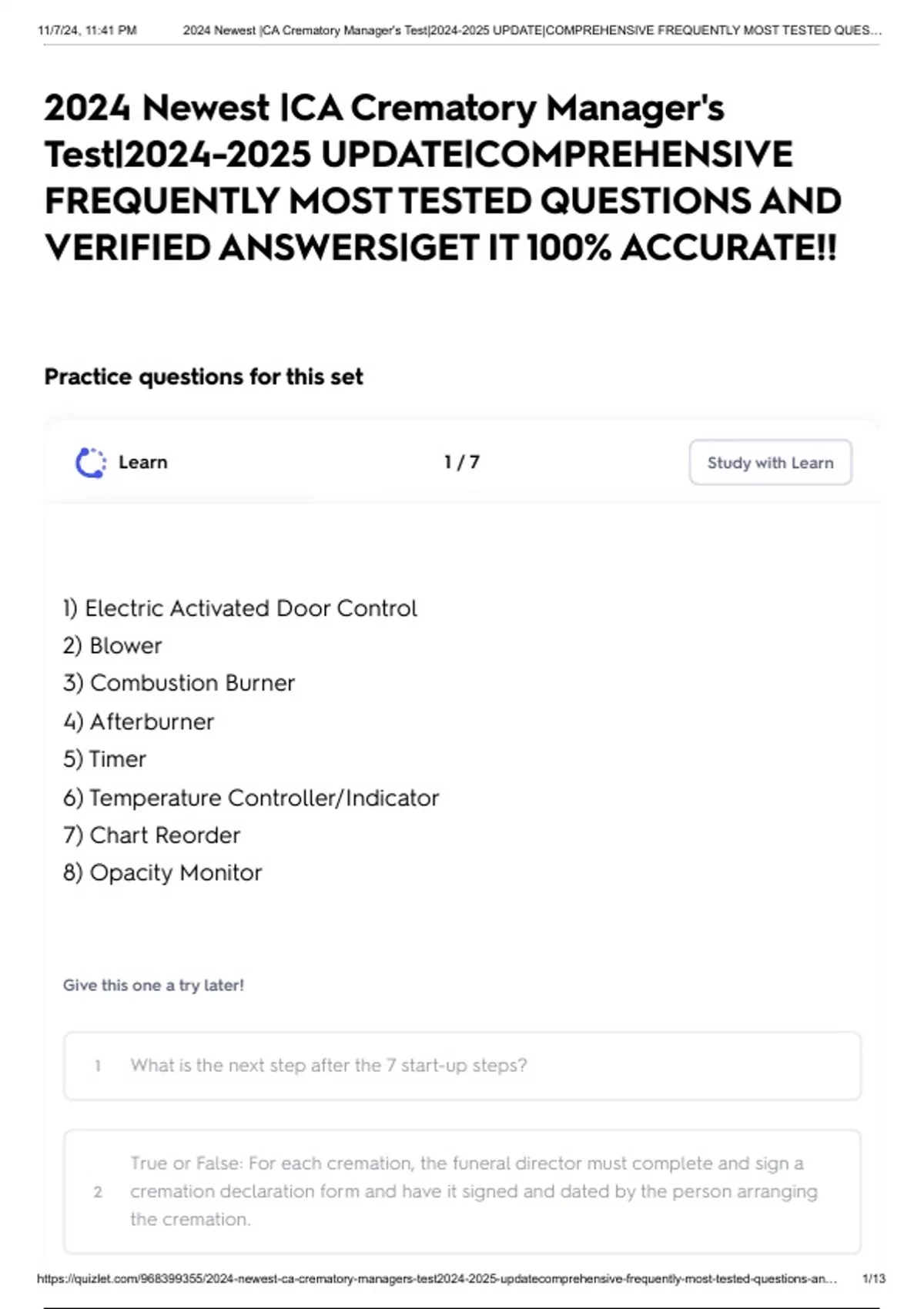 , 11/7/24, 11:41 PM 2024 Newest |CA Crematory Manager's Test|2024-2025 UPDATE|COMPREHENSIVE FREQUENTLY MOST TESTED QUES…