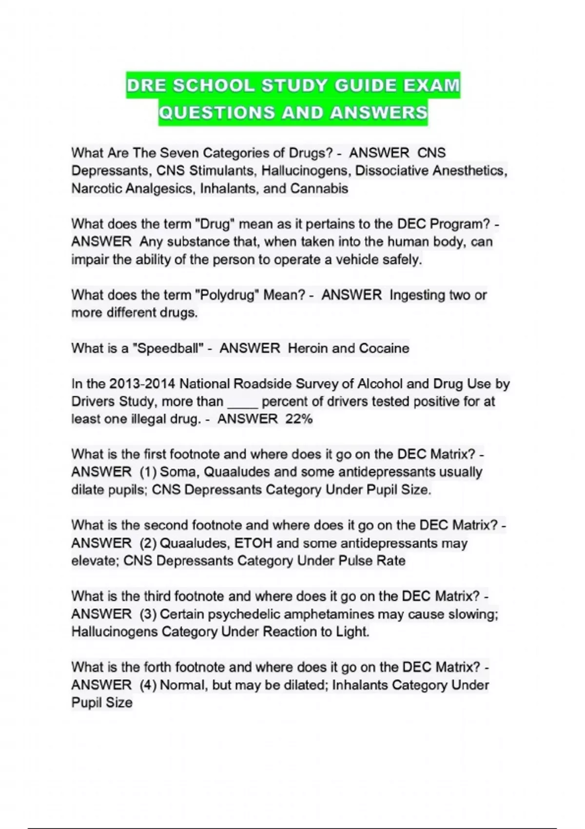 DRE SCHOOL STUDY GUIDE EXAM QUESTIONS AND ANSWERS