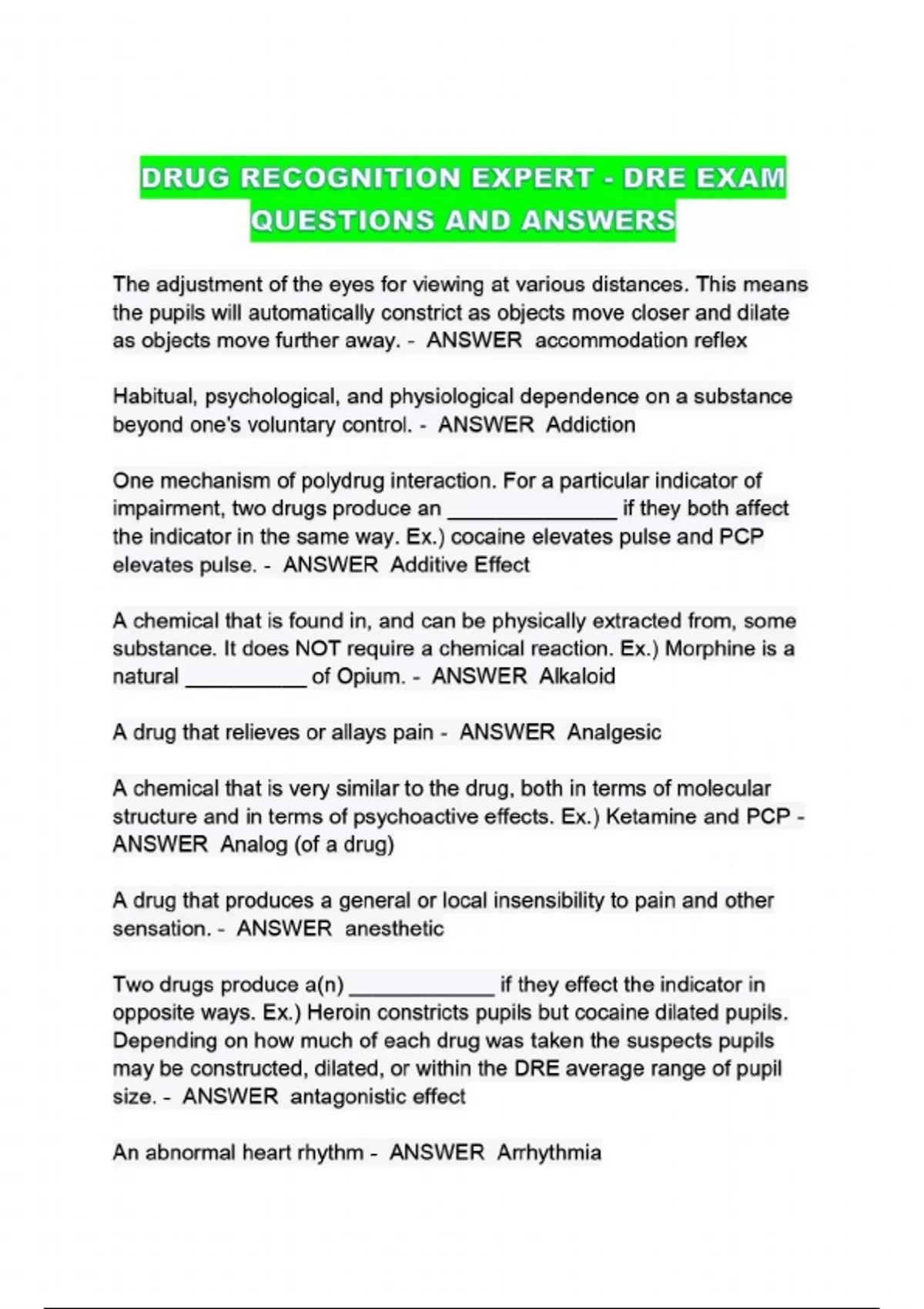 DRUG RECOGNITION EXPERT - DRE EXAM QUESTIONS AND ANSWERS....