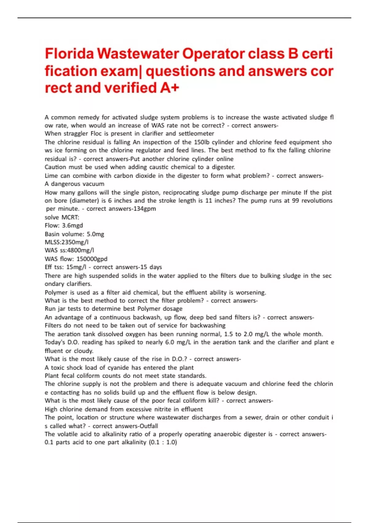 Florida Wastewater Operator class B certification exam| questions and answers correct and verified A+Florida Wastewater Operator class B certification exam| questions and answers correct and verified A+Florida Wastewater Operator class B certification exam| questions and answers correct and verified A+Florida Wastewater Operator class B certification exam| questions and answers correct and verified A+Florida Wastewater Operator class B certification exam| questions and answers correct and verified A+