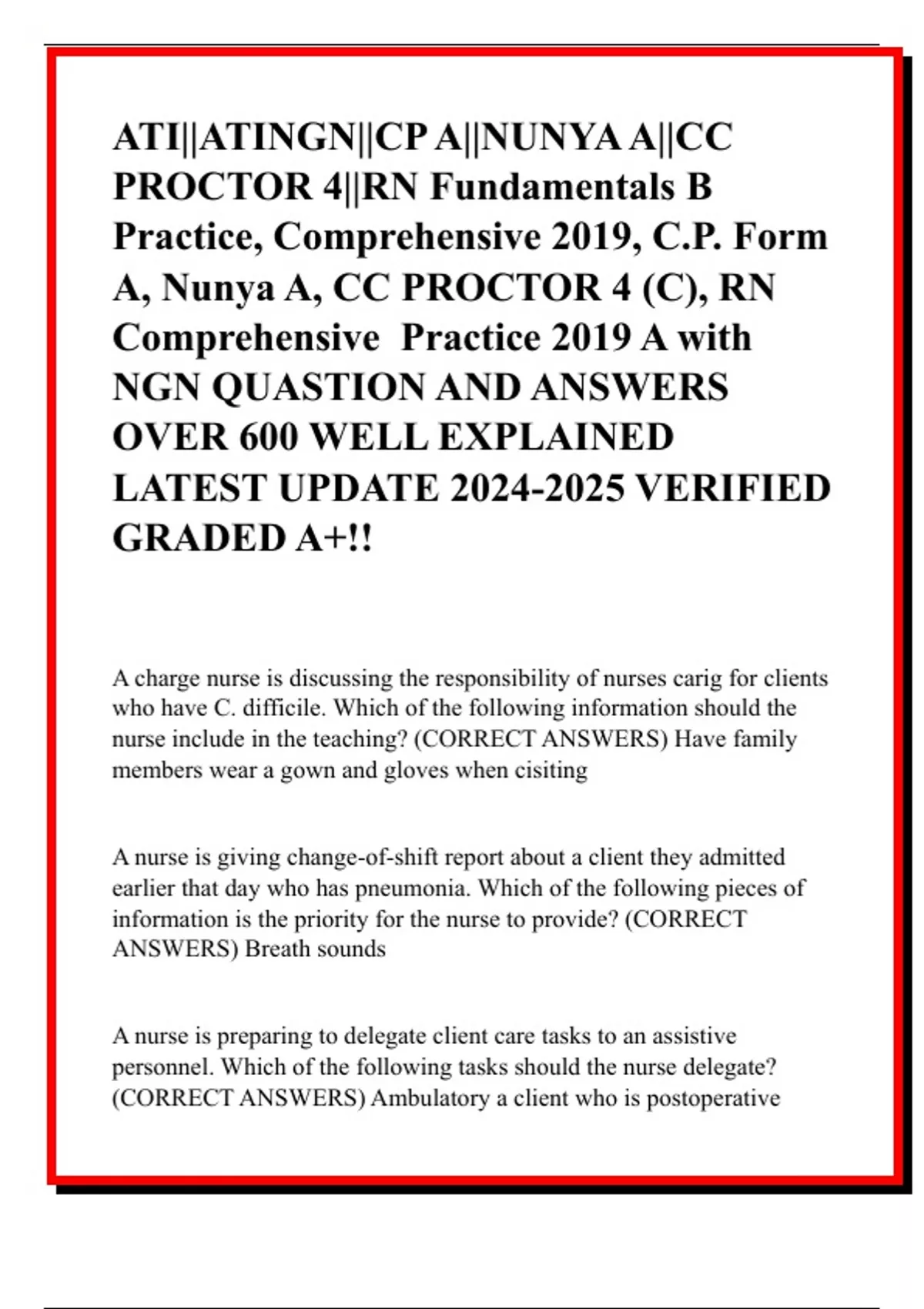 ATI||ATINGN||CP A||NUNYA A||CC PROCTOR 4||RN Fundamentals B Practice, Comprehensive 2019, C.P. Form A, Nunya A, CC PROCTOR 4 (C), RN Comprehensive Practice 2019 A with NGN QUASTION AND ANSWERS OVER 600 WELL EXPLAINED LATEST UPDATE VERIFIED GRADED A+!!