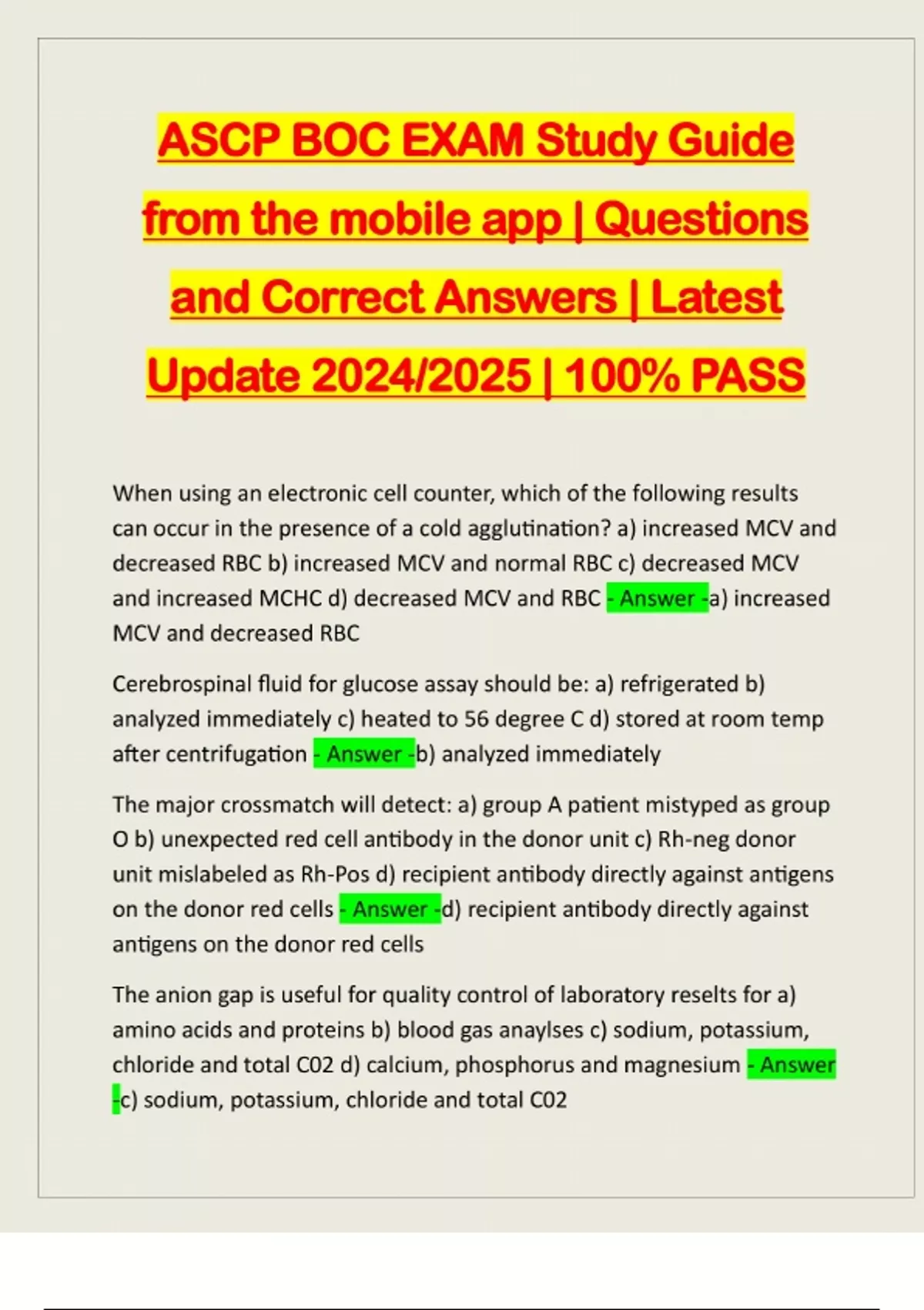 ASCP BOC EXAM Study Guide from the mobile app | Questions and Correct Answers | Latest Update 2024/2025 | 100% PASS When using an electronic cell counter, which of the following results can occur in the presence of a cold agglutination? a) increased MCV and decreased RBC b) increased MCV and normal RBC c) decreased MCV and increased MCHC d) decreased MCV and RBC - Answer -a) increased MCV and decreased RBC Cerebrospinal fluid for glucose assay should be: a) refrigerated b) analyzed immediately c) heated to 56 degree C d) stored at room temp after centrifugation - Answer -b) analyzed immediately The major crossmatch will detect: a) group A patient mistyped as group O b) unexpected red cell antibody in the donor unit c) Rh-neg donor unit mislabeled as Rh-Pos d) recipient antibody directly against antigens on the donor red cells - Answer -d) recipient antibody directly against antigens on the donor red cells The anion gap is useful for quality control of laboratory reselts for a) amino acids and proteins b) blood gas anaylses c) sodium, potassium, chloride and total C02 d) calcium, phosphorus and magnesium - Answer -c) sodium, potassium, chloride and total C02A common cause of respiratory alkalosis is a) vomitting b) starvation c) asthma d) hyperventilation - Answer -d) hyperventilation Blood is diluted 1:200, and a platelet count is performed. 180 platelets were counted in the center square millimeter on one side of the hemacytometer and 186 on the other side/ The total platelet count is: a) 146 x 10³/μL (146 x 10⁹/L) b)183 x 10³/μL (183 x 10⁹/L) c)366 x 10³/μL (3666 x 10⁹/L) d)732 x 10³/μL (732 x 10⁹/L) - Answer -c)366 x 10³/μL (3666 x 10⁹/L)