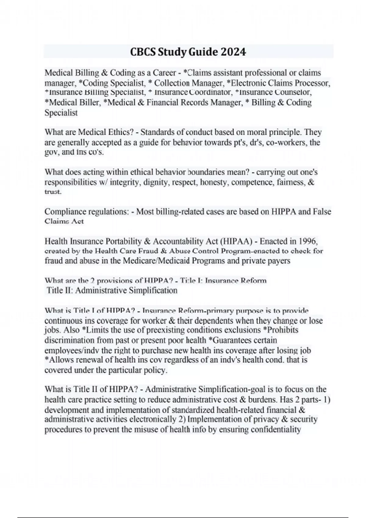 Medical Billing & Coding as a Career - *Claims assistant professional or claims manager, *Coding Specialist, * Collection Manager, *Electronic Claims Processor, *Insurance Billing Specialist, * Insurance Coordinator, *Insurance Counselor, *Medical Biller, *Medical & Financial Records Manager, * Billing & Coding Specialist What are Medical Ethics? - Standards of conduct based on moral principle. They are generally accepted as a guide for behavior towards pt's, dr's, co-workers, the gov, and ins co's. What does acting within ethical behavior boundaries mean? - carrying out one's responsibilities w/ integrity, dignity, respect, honesty, competence, fairness, & trust. Compliance regulations: - Most billing-related cases are based on HIPPA and False Claims Act Health Insurance Portability & Accountability Act (HIPAA) - Enacted in 1996, created by the Health Care Fraud & Abuse Control Program-enacted to check for fraud and abuse in the Medicare/Medicaid Programs and private payers What are the 2 provisions of HIPPA? - Title I: Insurance Reform Title II: Administrative Simplification What is Title I of HIPPA? - Insurance Reform-primary purpose is to provide continuous ins coverage for worker & their dependents when they change or lose jobs. Also *Limits the use of preexisting conditions exclusions *Prohibits discrimination from past or present poor health *Guarantees certain employees/indv the right to purchase new health ins coverage after losing job *Allows renewal of health ins cov regardless of an indv's health cond. that is covered under the particular policy. What is Title II of HIPPA? - Administrative Simplification-goal is to focus on the health care practice setting to reduce administrative cost & burdens. Has 2 parts- 1) development and implementation of standardized health-related financial & administrative activities electronically 2) Implementation of privacy & security procedures to prevent the misuse of health info by ensuring confidentiality What is the False Claims Act (FCA)? - Federal law that prohibits submitting a fraudulent claim or making a false statement or representation in connection w/ a claim. Also protects & rewards whistle-blowers. What is the National Correct Coding Initiative (NCCI)? - Developed by CMS to promote the national correct coding methodologies & to control improper coding that lead to inappropriate payment of Part B health ins claims. How many edits does NCCI include? - 2: 1)Column 1/Column 2 (prev called Comprehensive/Component) Edits Column 1/Column 2 edits (NCCI) - Identifies code pairs that should not be billed together b/c 1 code (Column 1) includes all the services described by another code (Column 2) Mutually Exclusive Edits (NCCI) - ID's code pairs that, for clinical reasons, are unlikely to be performed on the same pt on the same day What are the possible consequences of inaccurate coding and incorrect billing? - *delayed processing & payment of claims *reduced payments, denied claims *fine and/or imprisonment *exclusion from payer's programs, loss of dr's license to practice med Who has the task of investigate and prosecuting health care fraud & abuse? - The Office of Inspector General (OIG) Fraud - knowingly & intentionally deceiving or misrepresenting info that may result in unauthorized benefits. It is a felony and can result in fines and/or prison. Who audits claims? - State & federal agencies as well as private ins co's What are common forms of fraud? - billing for services not furnished, unbundling, & misrepresenting diagnosis to justify payment Abuse - incidences or practices, not usually considered fraudulent, that are inconsistent w/ the accepted medical business or fiscal practices in the industry. What are examples of Abuse? - submitting a claim for services/procedures performed that is not medically necessary, and excessive charges for services, equipment or supplies. What is a method use to minimize danger, hazards, & liabilities associated w/ abuse? - Risk Management Patient Confidentiality - All pt's have right to privacy & all info should remain privileged. Only discuss pt info when necessary to do job. Obtain a signed consent form to release medical info to ins co or other individual. When may providers use PHI (Protected Health Information) w/o specific authorization under the HIPPA Privacy Rule? - When using for TPO, Treatment (primarily for the purpose of discussion of pt's case w/ other dr's) Payment (providers submit claims on behalf of pt's) & Operations (for purposes such as training staff & quality improvement) What is Employer Liability? - Means physicians are legally responsible for their own conduct and any actions of their employees (designee) performed w/in the context of their employment. Referred to as "vicarious liability. A.K.A "respondent superior"-"let the master answer". Means employee can be sued & brought to trial What is Employee Liability? - "Errors & Omissions Insurance"-protection against loss of monies caused by failure through error or unintentional omission on the part of the indv or service submitting the claim. ****Some dr's contract w/ a billing service (clearinghouse) to handle claims submission, & some agreements contain a clause stating that the dr will hold the co harmless from "liability resulting from claims submitted by the service for any account", means dr is responsible for mistakes made by billing service, errors & omissions is not needed in the instance. ******However, if dr ever asks the ins biller to do the least bit questionable, such as write of pt's balances for certain pt's automatically, make sure you have a legal document or signed waiver of liability relieving you of responsibility for such actions. What is a Medical Record & what is it comprised of? - documentation of the pt's social & medical history, family history, physical exam findings, progress notes, radiology & lab results, consultation reports and correspondence to pt- Is the foremost tool of clinical care and com