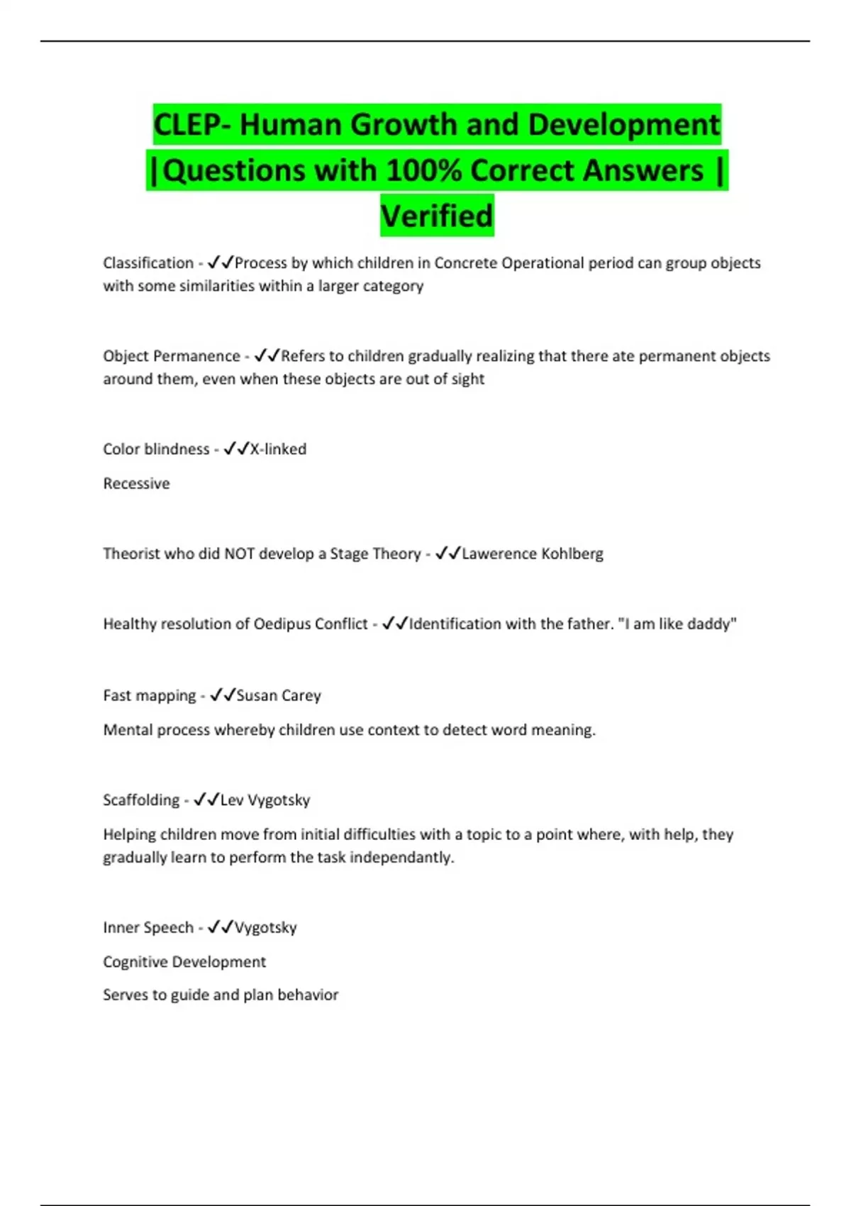 CLEP- Human Growth and Development |Questions with 100% Correct Answers | Verified