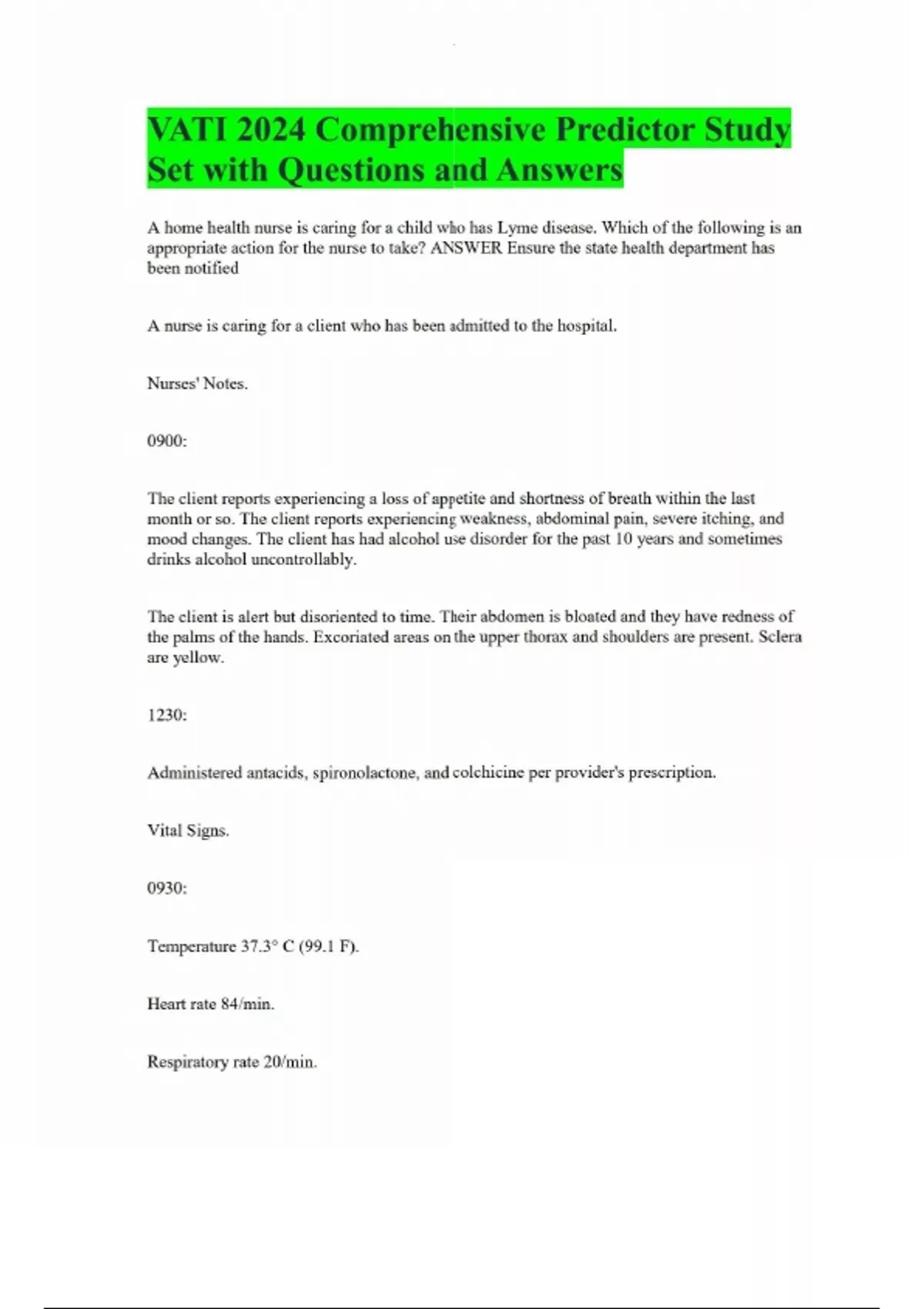 VATI 2024 Comprehensive Predictor Study Set with Questions and Answers A home health nurse is caring for a child who has Lyme disease. Which of the following is an appropriate action for the nurse to take? ANSWER Ensure the state health department has been notified A nurse is caring for a client who has been admitted to the hospital. Nurses' Notes. 0900: The client reports experiencing a loss of appetite and shortness of breath within the last month or so. The client reports experiencing weakness, abdominal pain, severe itching, and mood changes. The client has had alcohol use disorder for the past 10 years and sometimes drinks alcohol uncontrollably. The client is alert but disoriented to time. Their abdomen is bloated and they have redness of the palms of the hands. Excoriated areas on the upper thorax and shoulders are present. Sclera are yellow. 1230: Administered antacids, spironolactone, and colchicine per provider's prescription. Vital Signs. 0930: Temperature 37.3° C (99.1 F). Heart rate 84/min. Respiratory rate 20/min.