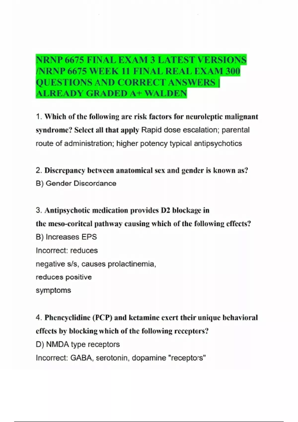 NRNP 6675 FINAL EXAM 3 LATEST VERSIONS /NRNP 6675 WEEK 11 FINAL REAL EXAM 300 QUESTIONS AND CORRECT ANSWERS | ALREADY GRADED A+ WALDEN 1. Which of the following are risk factors for neuroleptic malignant syndrome? Select all that apply Rapid dose escalation; parental route of administration; higher potency typical antipsychotics 2. Discrepancy between anatomical sex and gender is known as? B) Gender Discordance 3. Antipsychotic medication provides D2 blockage in the meso-coritcal pathway causing which of the following effects? B) Increases EPS Incorrect: reduces negative s/s, causes prolactinemia, reduces positive symptoms 4. Phencyclidine (PCP) and ketamine exert their unique behavioral effects by blocking which of the following receptors? D) NMDA type receptors Incorrect: GABA, serotonin, dopamine "receptors"