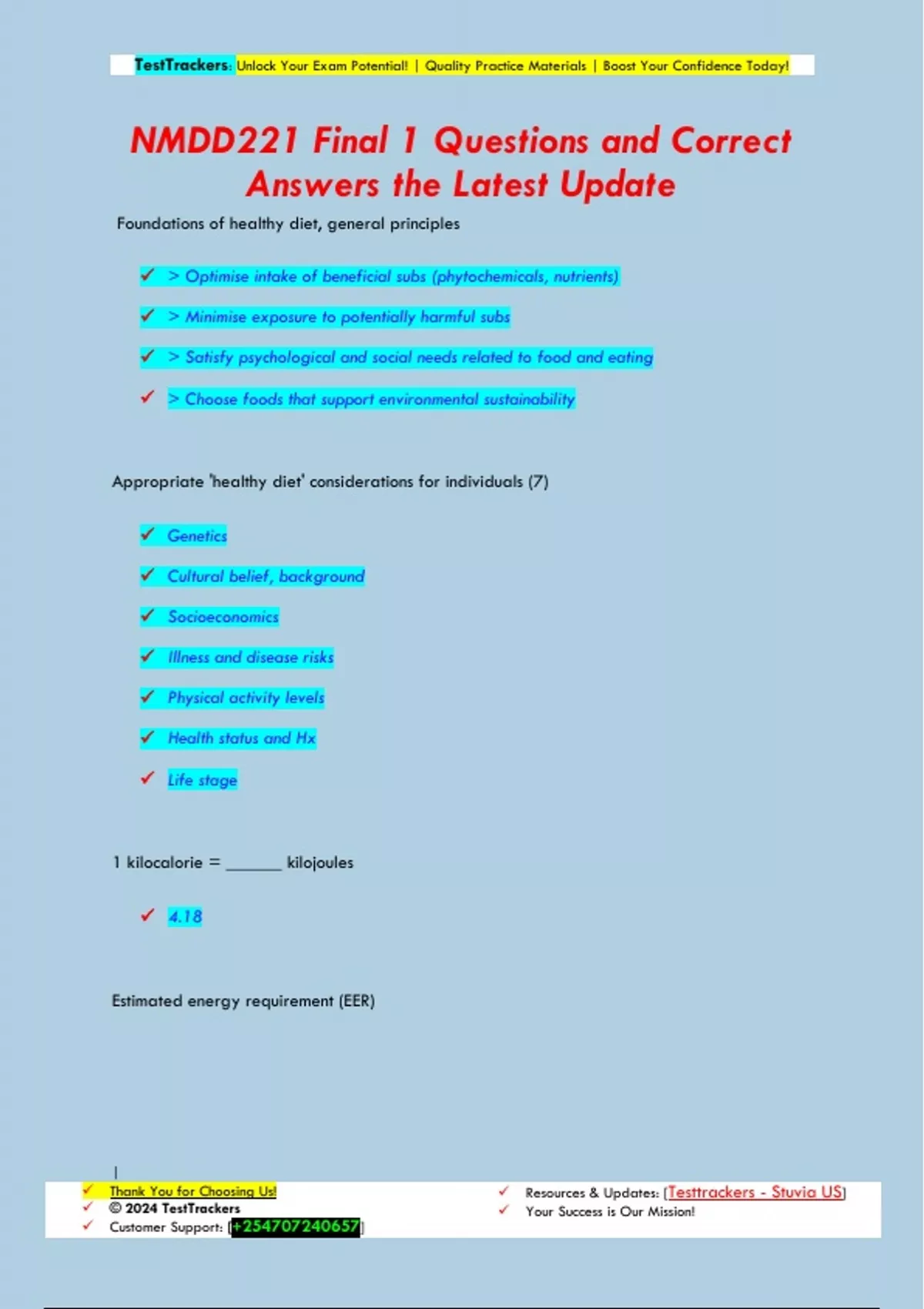 Foundations of healthy diet, general principles > Optimise intake of beneficial subs (phytochemicals, nutrients) > Minimise exposure to potentially harmful subs > Satisfy psychological and social needs related to food and eating > Choose foods that support environmental sustainability Appropriate 'healthy diet' considerations for individuals (7) Genetics Cultural belief, background Socioeconomics Illness and disease risks Physical activity levels Health status and Hx Life stage 1 kilocalorie = ______ kilojoules 4.18 Estimated energy requirement (EER) TestTrackers: Unlock Your Exam Potential! | Quality Practice Materials | Boost Your Confidence Today! | Thank You for Choosing Us! © 2024 TestTrackers Customer Support: [+2547072