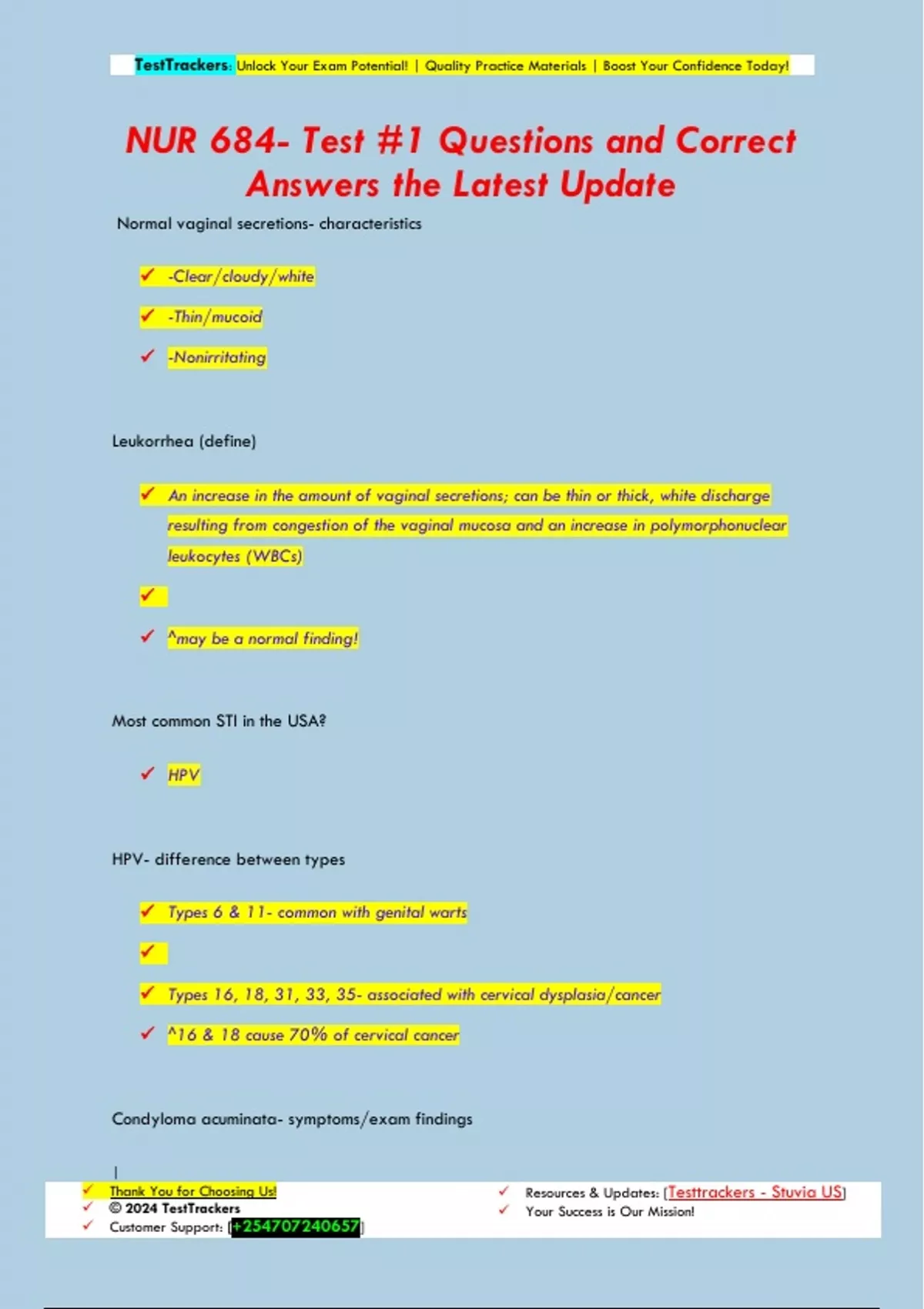 Normal vaginal secretions- characteristics -Clear/cloudy/white -Thin/mucoid -Nonirritating Leukorrhea (define) An increase in the amount of vaginal secretions; can be thin or thick, white discharge resulting from congestion of the vaginal mucosa and an increase in polymorphonuclear leukocytes (WBCs) ^may be a normal finding! Most common STI in the USA? HPV HPV- difference between types Types 6 & 11- common with genital warts Types 16, 18, 31, 33, 35- associated with cervical dysplasia/cancer ^16 & 18 cause 70% of cervical cancer Condyloma acuminata- symptoms/exam findings TestTrackers: Unlock Your Exam Potential! | Quality Practice Materials | Boost Your Confidence Today! | Thank You for Choosing Us! © 2024 TestTrackers Customer Support: [] Resources & Updates: [Testtrackers - Stuvia US] Your Success is Our Mission! -Single or multiple soft, fleshy, keratinized growths around vulvovaginal area, anus, or penis -Painless Condyloma acuminata- diagnostic tests Diagnosis usually based on clinical presentation! -Consider VDRL/RPR to exclude syphilis -Biopsy only if atypical characteristics or no response to standard therapy Condyloma acuminata- complications -Cervical dysplasia/cancer with certain HPV serotypes -Transmission to infant during vaginal delivery Condyloma acuminata- treatment (clinician-administered) -Cryotherapy with liquid nitrogen or cryoprobe Q 1-2 weeks -Trichloroacetic acid or bichloracetic acid -Surgical removal Condyloma acuminata- treatment (patient-administered) -Podofilox 0.5% solution/gel -Imiquimod 3.75% or 5% cream -Sinecatechins 15% ointment TestTrackers: Unlock Your Exam Potential! | Quality Practice Materials | Boost Your Confidence Today! | Thank You for Choosing Us! © 2024 TestTrackers Customer Support: [] Resources & Updates: [Testtrackers - Stuvia US] Your Success is Our Mission! Molluscum contagiosum- symptoms/exam findings -1-5 mm smooth, round, firm, shiny, flesh colored to pearly white papules with central umbilication -Usually on trunk or anogenital areas -White cheesy material expressed from papule -Painles