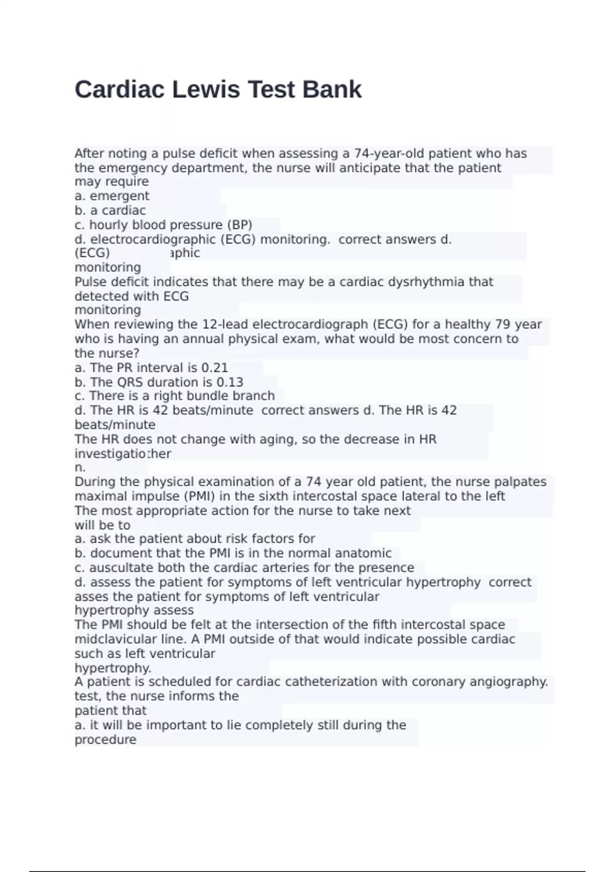 After noting a pulse deficit when assessing a 74-year-old patient who has just arrived in the emergency department, the nurse will anticipate that the patient may require a. emergent cardioversion. b. a cardiac catheterization. c. hourly blood pressure (BP) checks. d. electrocardiographic (ECG) monitoring. correct answers d. electrocardiographic (ECG) monitoring Pulse deficit indicates that there may be a cardiac dysrhythmia that would best be detected with ECG monitoring When reviewing the 12-lead electrocardiograph (ECG) for a healthy 79 year old patient who is having an annual physical exam, what would be most concern to the nurse? a. The PR interval is 0.21 seconds b. The QRS duration is 0.13 seconds c. There is a right bundle branch block d. The HR is 42 beats/minute correct answers d. The HR is 42 beats/minute The HR does not change with aging, so the decrease in HR requires further investigation. During the physical examination of a 74 year old patient, the nurse palpates the point of maximal impulse (PMI) in the sixth intercostal space lateral to the left midclavicular line. The most appropriate action for the nurse to take next will be to a. ask the patient about risk factors for atherosclerosis b. document that the PMI is in the normal anatomic location c. auscultate both the cardiac arteries for the presence of a bruit d. assess the patient for symptoms of left ventricular hypertrophy correct answers d. asses the patient for symptoms of left ventricular hypertrophy assess The PMI should be felt at the intersection of the fifth intercostal space and the left midclavicular line. A PMI outside of that would indicate possible cardiac enlargement, such as left ventricular hypertrophy. A patient is scheduled for cardiac catheterization with coronary angiography. Before the test, the nurse informs the patient that a. it will be important to lie completely still during the procedure b. a flushed feeling may be