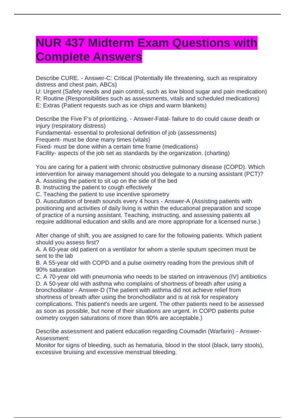 NUR 437 Midterm Exam Questions with