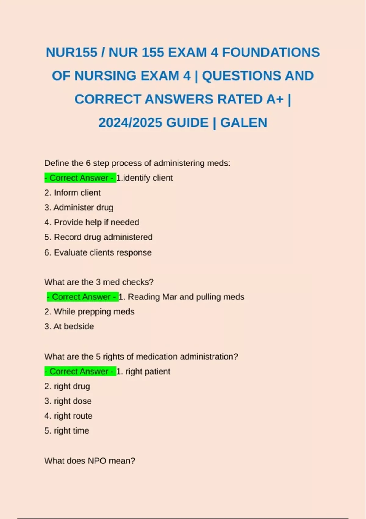 NUR155 / NUR 155 EXAM 4 FOUNDATIONS OF NURSING EXAM 4 | QUESTIONS AND CORRECT ANSWERS RATED A+ | 2024/2025 GUIDE | GALEN