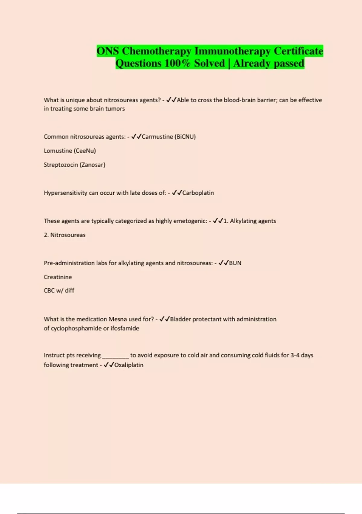ONS Chemotherapy Immunotherapy Certificate Questions 100% Solved | Already passed