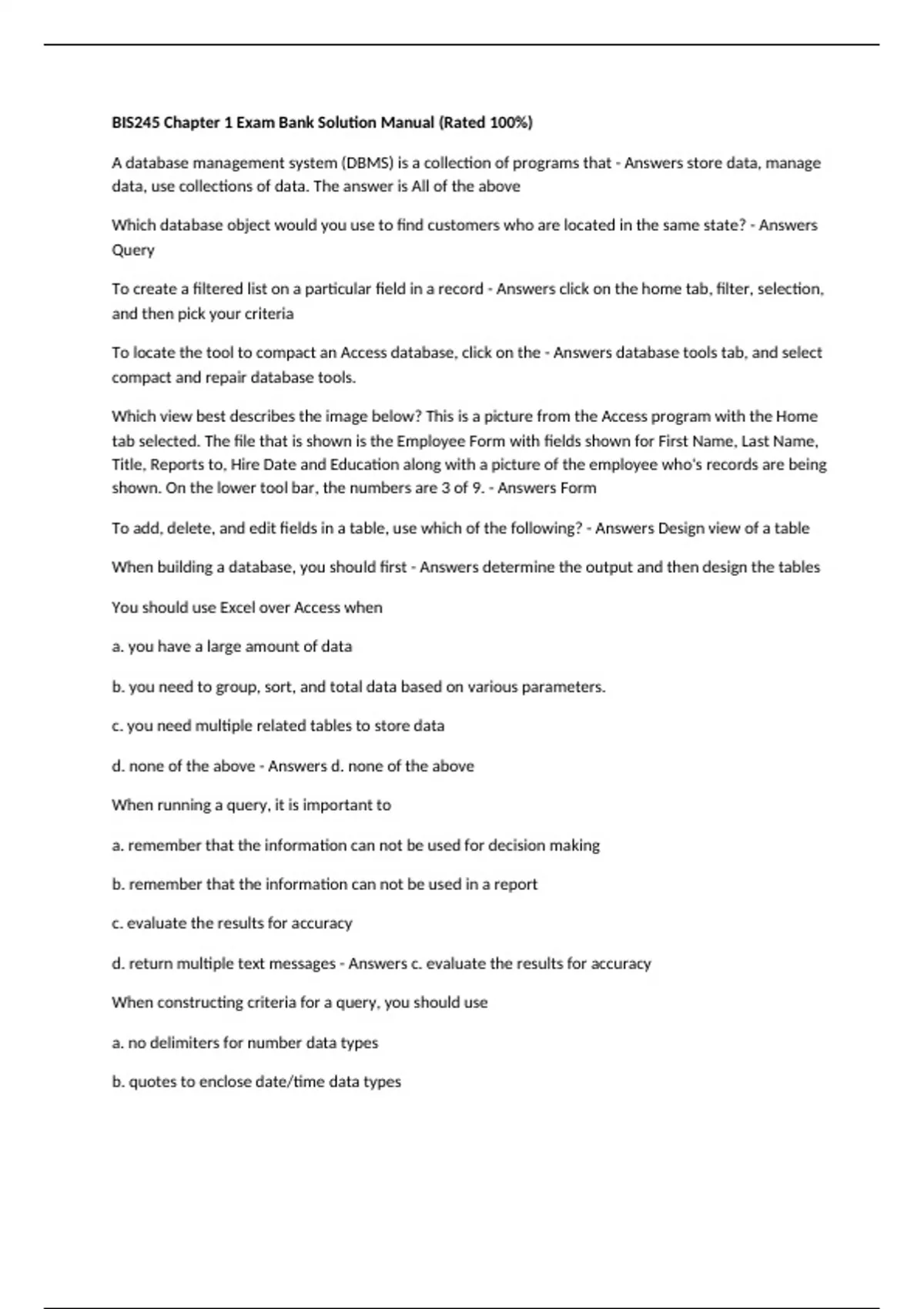 BIS245 Chapter 1 Exam Bank Solution Manual (Rated 100%) A database management system (DBMS) is a collection of programs that - Answers store data, manage data, use collections of data. The answer is All of the above Which database object would you use to find customers who are located in the same state? - Answers Query To create a filtered list on a particular field in a record - Answers click on the home tab, filter, selection, and then pick your criteria To locate the tool to compact an Access database, click on the - Answers database tools tab, and select compact and repair database tools. Which view best describes the image below? This is a picture from the Access program with the Home tab selected. The file that is shown is the Employee Form with fields shown for First Name, Last Name, Title, Reports to, Hire Date and Education along with a picture of the employee who's records are being shown. On the lower tool bar, the numbers are 3 of 9. - Answers Form To add, delete, and edit fields in a table, use which of the following? - Answers Design view of a table When building a database, you should first - Answers determine the output and then design the tables You should use Excel over Access when a. you have a large amount of data b. you need to group, sort, and total data based on various parameters. c. you need multiple related tables to store data d. none of the above - Answers d. none of the above When running a query, it is important to a. remember that the information can not be used for decision making b. remember that the information can not be used in a report c. evaluate the results for accuracy d. return multiple text messages - Answers c. evaluate the results for accuracy When constructing criteria for a query, you should use