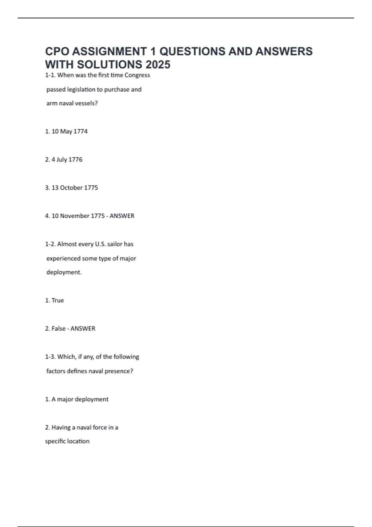1-1. When was the first time Congress passed legislation to purchase and arm naval vessels? 1. 10 May 1774 2. 4 July 1776 3. 13 October 1775 4. 10 November 1775 - ANSWER 1-2. Almost every U.S. sailor has experienced some type of major deployment. 1. True 2. False - ANSWER 1-3. Which, if any, of the following factors defines naval presence? 1. A major deployment 2. Having a naval force in a specific location 3. Deploying to a hostile area to confront adversaries 4. None of the above - ANSWER 1-4. Deployments place naval forces in position