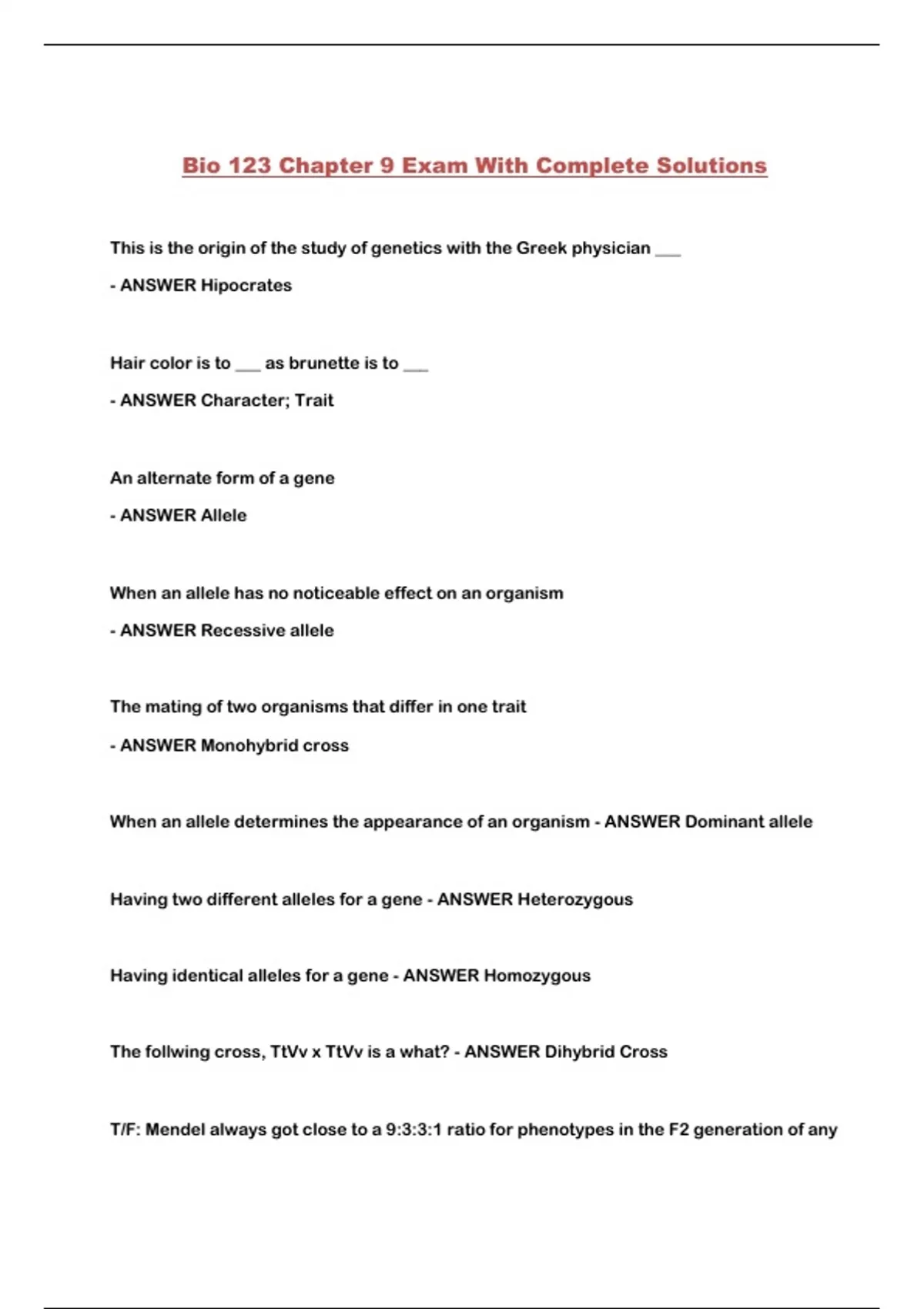 Bio 123 Chapter 9 Exam With Complete Solutions