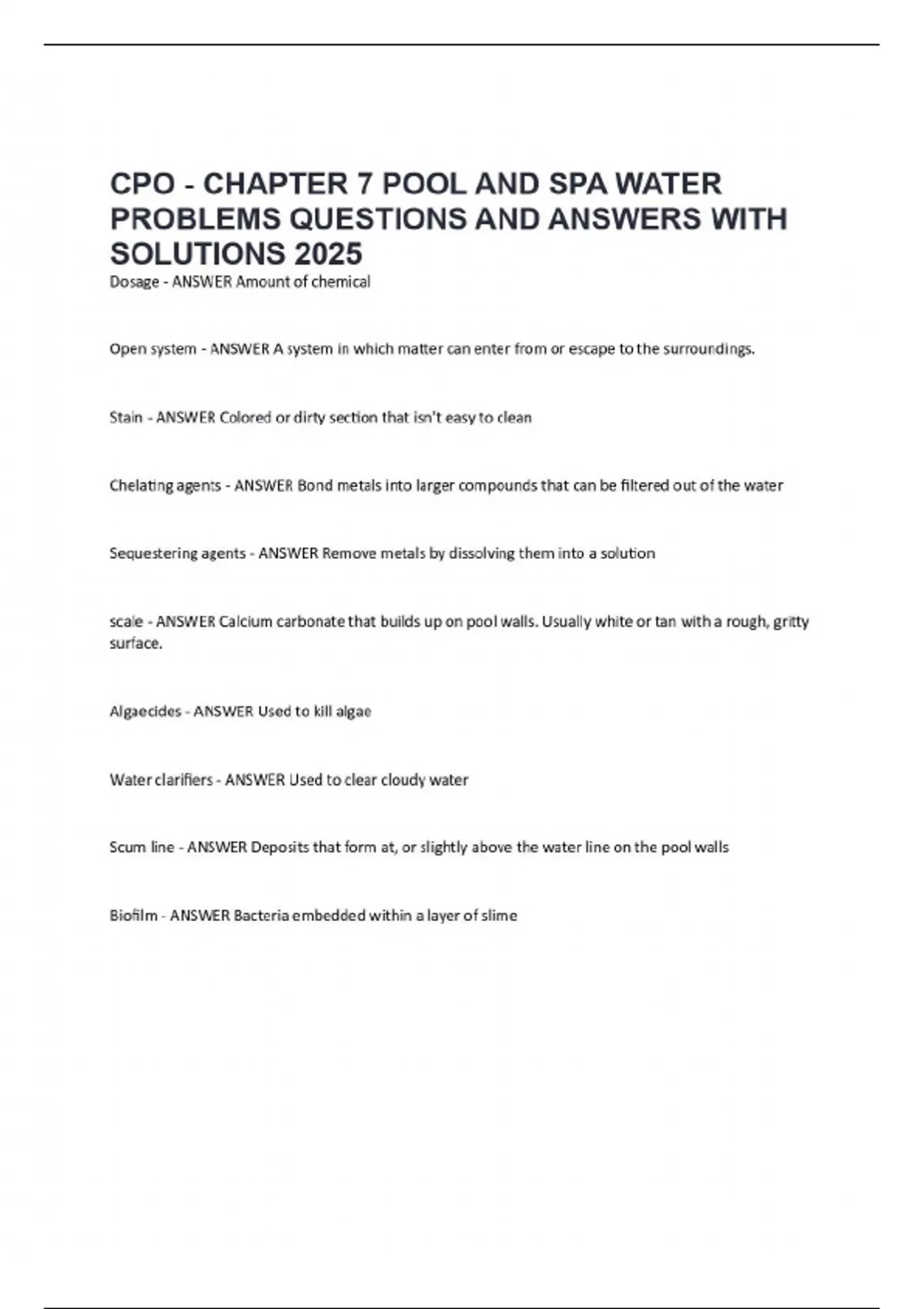 CPO - CHAPTER 7 POOL AND SPA WATER PROBLEMS QUESTIONS AND ANSWERS WITH SOLUTIONS 2025