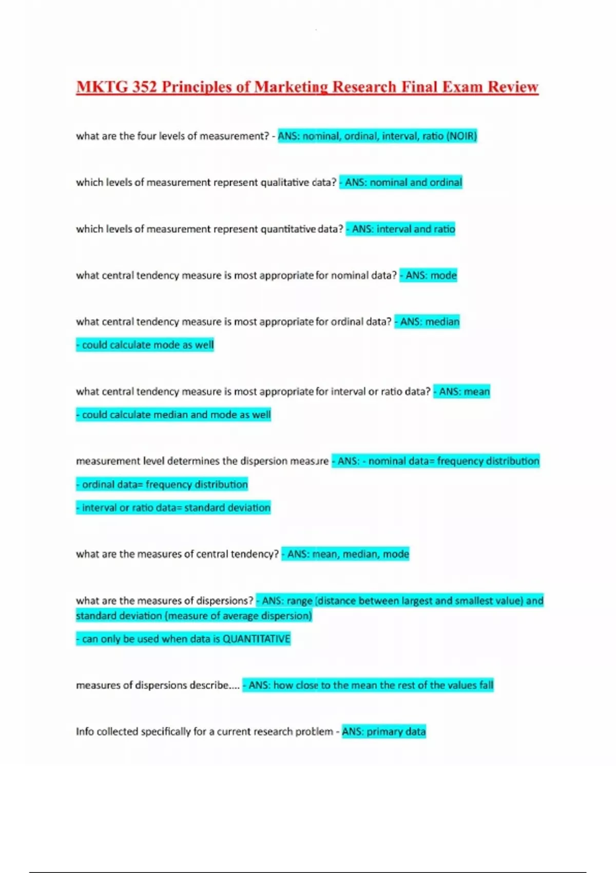 MKTG 352 Principles of Marketing Research Final Exam Review