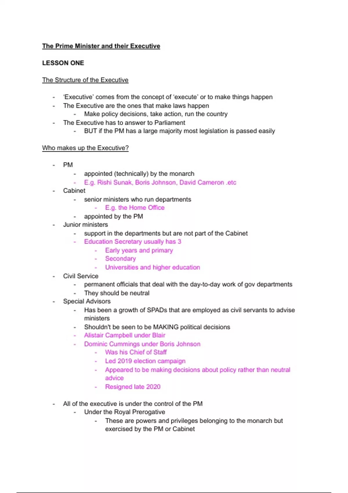 Summary/Revision - The Prime Minister and their Executive
