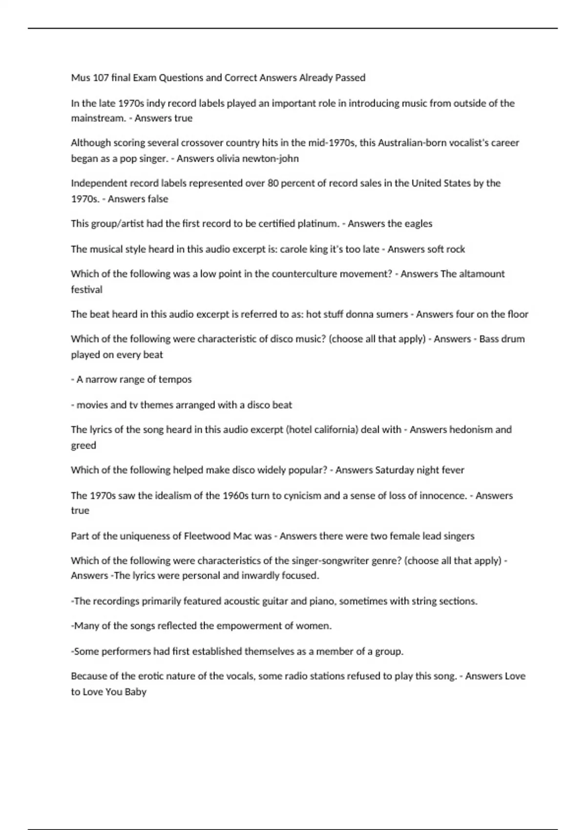 Mus 107 final Exam Questions and Correct Answers Already Passed In the late 1970s indy record labels played an important role in introducing music from outside of the mainstream. - Answers true Although scoring several crossover country hits in the mid-1970s, this Australian-born vocalist's career began as a pop singer. - Answers olivia newton-john Independent record labels represented over 80 percent of record sales in the United States by the 1970s. - Answers false This group/artist had the first record to be certified platinum. - Answers the eagles The musical style heard in this audio excerpt is: carole king it's too late - Answers soft rock Which of the following was a low point in the counterculture movement? - Answers The altamount festival The beat heard in this audio excerpt is referred to as: hot stuff donna sumers - Answers four on the floor Which of the following were characteristic of disco music? (choose all that apply) - Answers - Bass drum played on every beat - A narrow range of tempos - movies and tv themes arranged with a disco beat The lyrics of the song heard in this audio excerpt (hotel california) deal with - Answers hedonism and greed Which of the following helped make disco widely popular? - Answers Saturday night fever The 1970s saw the idealism of the 1960s turn to cynicism and a sense of loss of innocence. - Answers true Part of the uniqueness of Fleetwood Mac was - Answers there were two female lead singers Which of the following were characteristics of the singer-songwriter genre? (choose all that apply) - Answers -The lyrics were personal and inwardly focused. -The recordings primarily featured acoustic guitar and piano, sometimes with string sections. -Many of the songs reflected the empowerment of women. -Some performers had first established themselves as a member of a group. Because of the erotic nature of the vocals, some radio stations refused to play this song. - Answers Love to Love You Baby this musical style may be seen as a reaction to the rock ethos. - Answers disco In the 1970s, the primary way of introducing and popularizing new rock music became - Answers FM Radio Match the recording artist with their associated musical genre: - Answers The Bee Gees:disco Fleetwood Mac:mainstream pop/rock John Denver:country James Taylor:soft rock What was the motivation of record companies and radio stations in creating and targeting new demographics in the early 1970s? - Answers increased sales and revenues This rock star had a fictional persona of an androgynous rock star from outer space. - Answers david bowie This artist was a versatile piano player, ranging stylistically from pop to rock 'n' roll to gospel. Flexibility was a hallmark of his style. - Answers elton john The style of rock heard in this audio excerpt is (roundabout by yes) - Answers progressive rock This band/artist's stage show included executions by electric chair, guillotine, and hanging. - Answers alice cooper What was the nucleus of heavy metal bands? - Answers electric guitar, electric bass, and drums Match the band or artist with the associated musical genre. - Answers Led Zeppelin:heavy metal Alice Cooper:glam rock The Band:country rock Emerson,Lake,and Palmer:progressive rock The Allman Brothers:southern rock This group's music was an eclectic mix of blues, rock 'n' roll, and folk. - Answers the band Which of the following instruments were popular with art rock bands? (choose all that apply) - Answers the Minimoog electronic synthesizers the Mellotron Although this song is a "non-radio friendly" eight minutes in length, it is one of the most played songs in the history of radio. - Answers stairway to heaven This style of rock was rooted in the blues and country, and the groups often contained two or more electric guitarists. - Answers southern rock Art rock was fundamentally a raw and rebellious populist movement. - Answers false The focus of this style was on technical virtuosity, especially on the guitar. - Answers heavy metal The style of rock heard in this audio excerpt is whole lotta love by led zepplin - Answers heavy metal Bob Dylan's Nashville recordings were an inspiration for the country rock genre. - Answers true "Ska" is a term that is derived from - Answers the sound of the offbeat accents The new styles that began to appear from the peripheries of the music business were for the most part (choose all that apply) - Answers back to basics rebellions a reaction to the dominance of the mainstream representative of the desire for more choices The demographic of the early American reggae audience was teenagers. - Answers false Which of the following preceded reggae as a style of Jamaican music? (choose all that apply) - Answers ska rock steady burru? When contrasting progressive country and mainstream country, which of the following is NOT true? - Answers progressive country artists were more polished than mainstream country artists What was the label used by the music industry for music that bridged the gap between rock and country? - Answers outlaw country The biggest cover of a reggae song was - Answers I shot the sheriff Which of the following bands were influential on the punk rock movement? (choose all that apply) - Answers the stooges mc5 kingsmen?