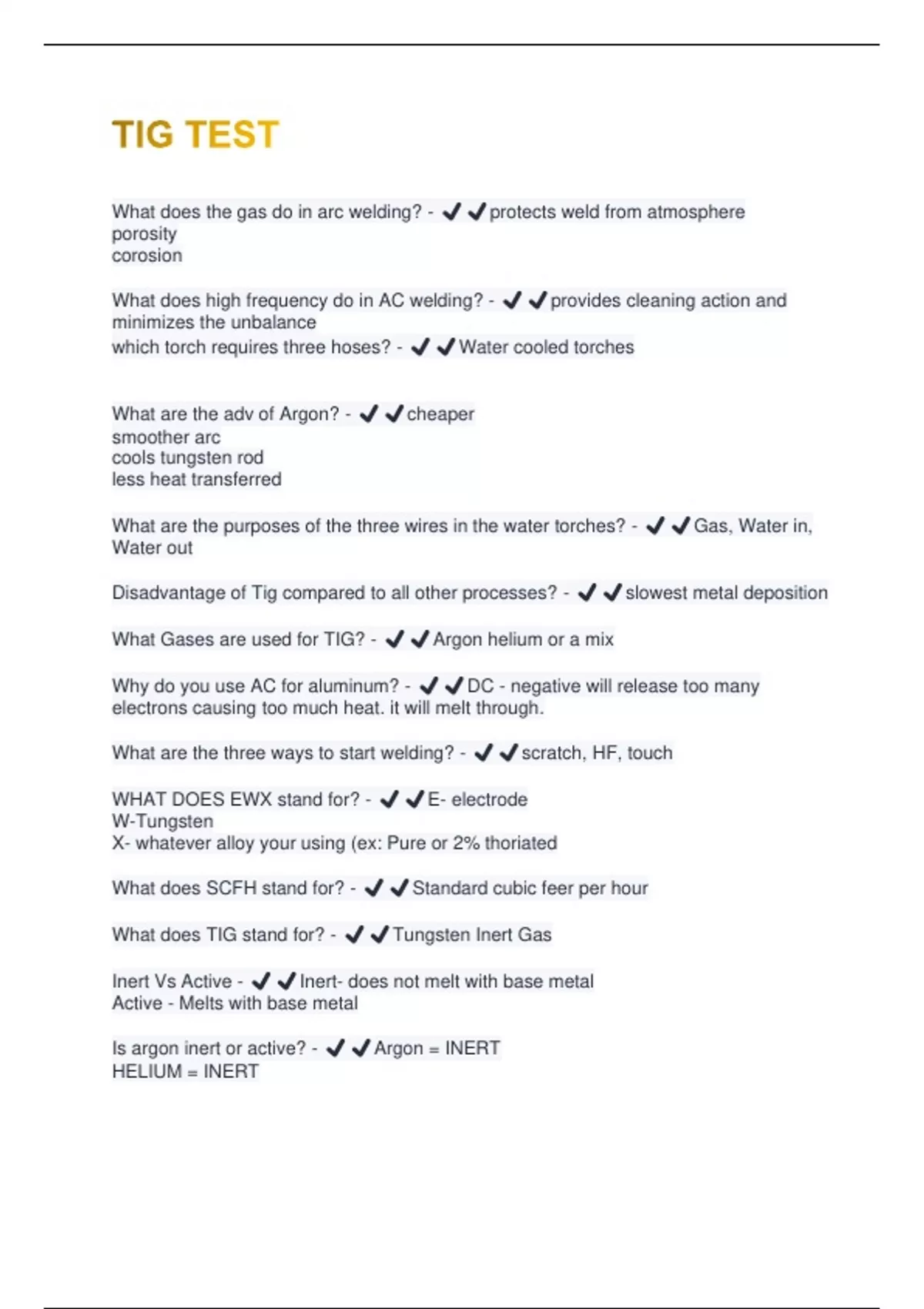 What does the gas do in arc welding? - ️️protects weld from atmosphere porosity corosion What does high frequency do in AC welding? - ️️provides cleaning action and minimizes the unbalance which torch requires three hoses? - ️️Water cooled torches What are the adv of Argon? - ️️cheaper smoother arc cools tungsten rod less heat transferred What are the purposes of the three wires in the water torches? - ️️Gas, Water in, Water out Disadvantage of Tig compared to all other processes? - ️️slowest metal deposition What Gases are used for TIG? - ️️Argon helium or a mix Why do you use AC for aluminum? - ️️DC - negative will release too many electrons causing too much heat. it will melt through. What are the three ways to start welding? - ️️scratch, HF, touch WHAT DOES EWX stand for? - ️️E- electrode W-Tungsten X- whatever alloy your using (ex: Pure or 2% thoriated What does SCFH stand for? - ️️Standard cubic feer per hour What does TIG stand for? - ️️Tungsten Inert Gas Inert Vs Active - ️️Inert- does not melt with base metal Active - Melts with base metal Is argon inert or active? - ️️Argon = INERT HELIUM = INERTADVANTAGE OF HELIUM - ️️SMALLER HAZ Transfers lots of heat use on thick metals COLOR EWP - ️️green COLOR EWCe-2 - ️️ORange COLOR EWLa-1 - ️️black