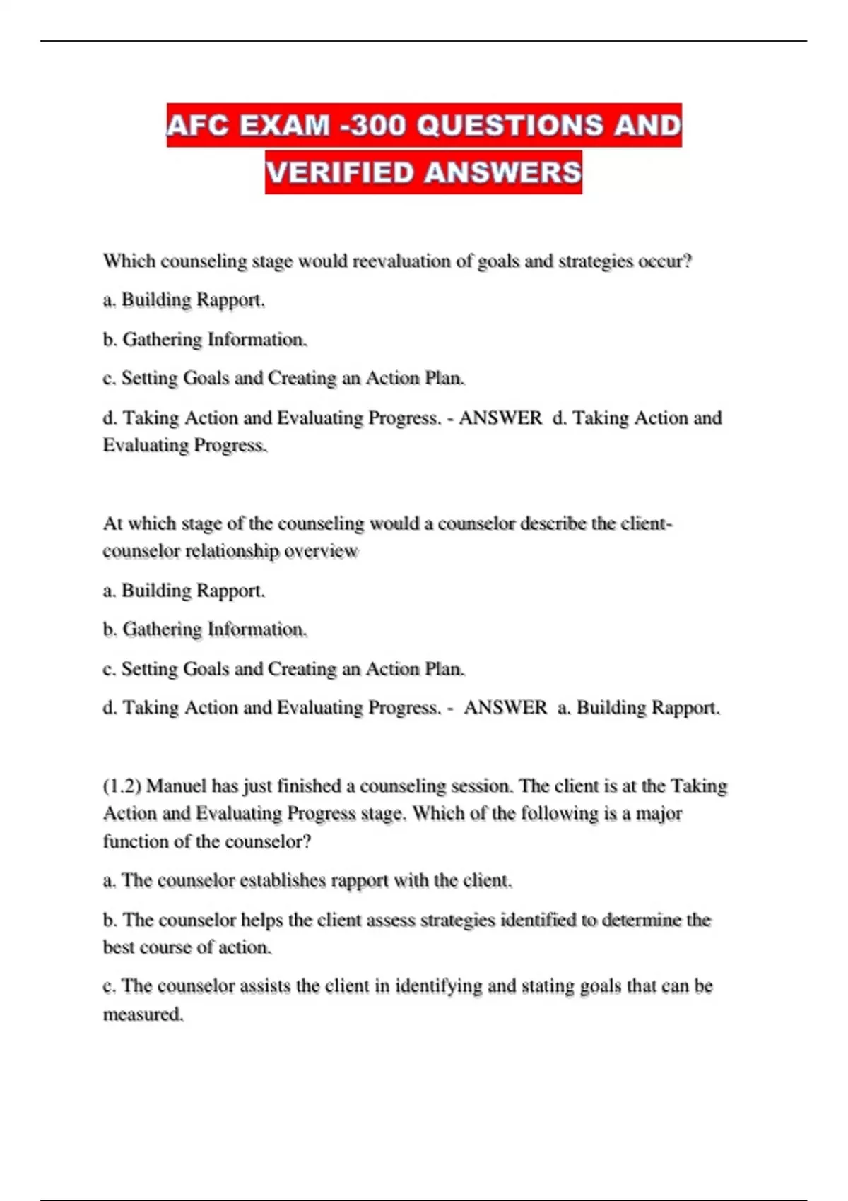 d. Taking Action and Evaluating Progress. - ANSWER a. Building Rapport.