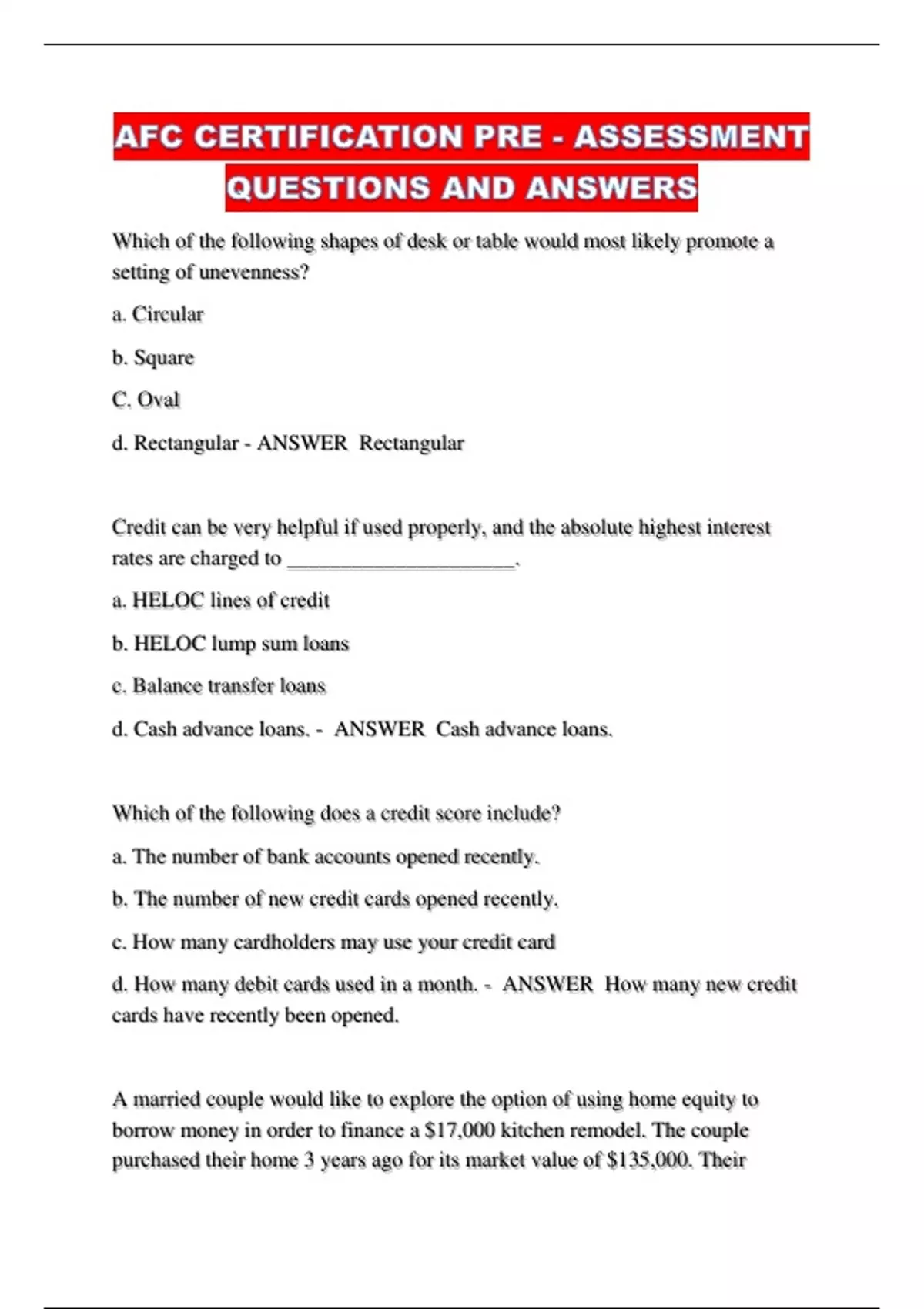 AFC CERTIFICATION PRE - ASSESSMENT QUESTIONS AND ANSWERS...