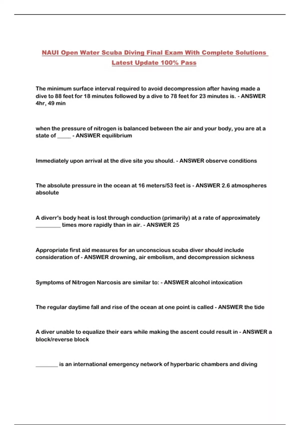 NAUI Open Water Scuba Diving Final Exam With Complete Solutions