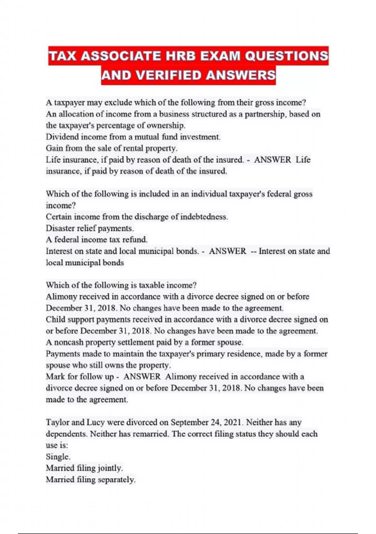 TAX ASSOCIATE HRB EXAM QUESTIONS AND VERIFIED ANSWERS