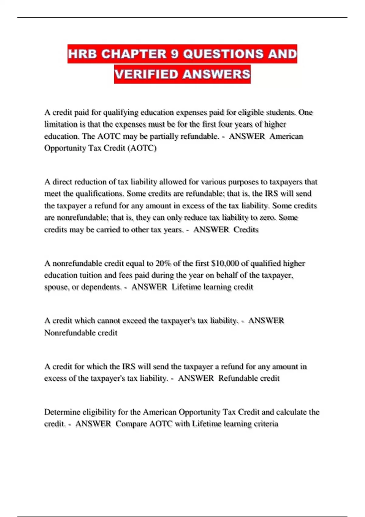 HRB CHAPTER 9 QUESTIONS AND VERIFIED ANSWERS....