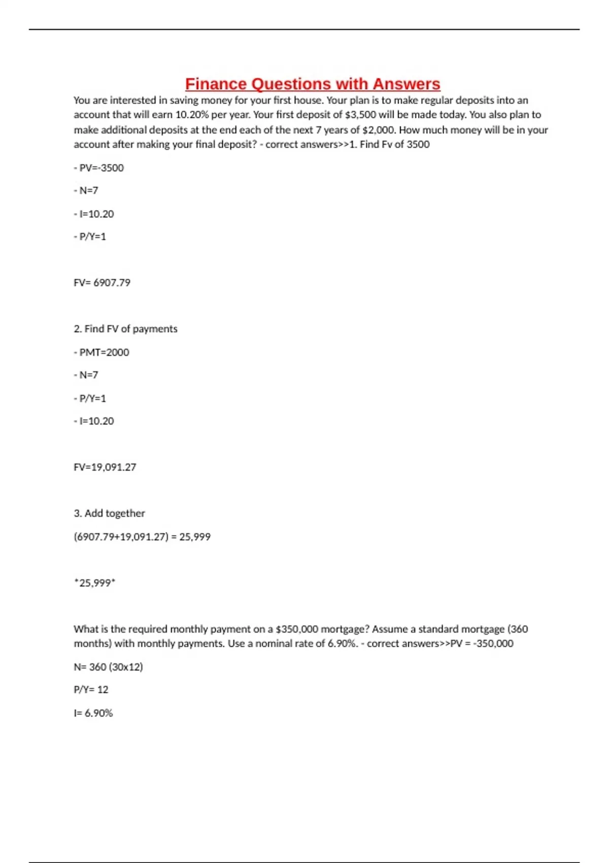 Finance Questions with Answers You are interested in saving money for your first house. Your plan is to make regular deposits into an account that will earn 10.20% per year. Your first deposit of $3,500 will be made today. You also plan to make additional deposits at the end each of the next 7 years of $2,000. How much money will be in your account after making your final deposit? - correct answers>>1. Find Fv of 3500 - PV=-3500 - N=7 - I=10.20 - P/Y=1 FV= 6907.79 2. Find FV of payments - PMT=2000 - N=7 - P/Y=1 - I=10.20 FV=19,091.27 3. Add together (6907.79+19,091.27) = 25,999 *25,999* What is the required monthly payment on a $350,000 mortgage? Assume a standard mortgage (360 months) with monthly payments. Use a nominal rate of 6.90%. - correct answers>>PV = -350,000 N= 360 (30x12) P/Y= 12 I= 6.90%