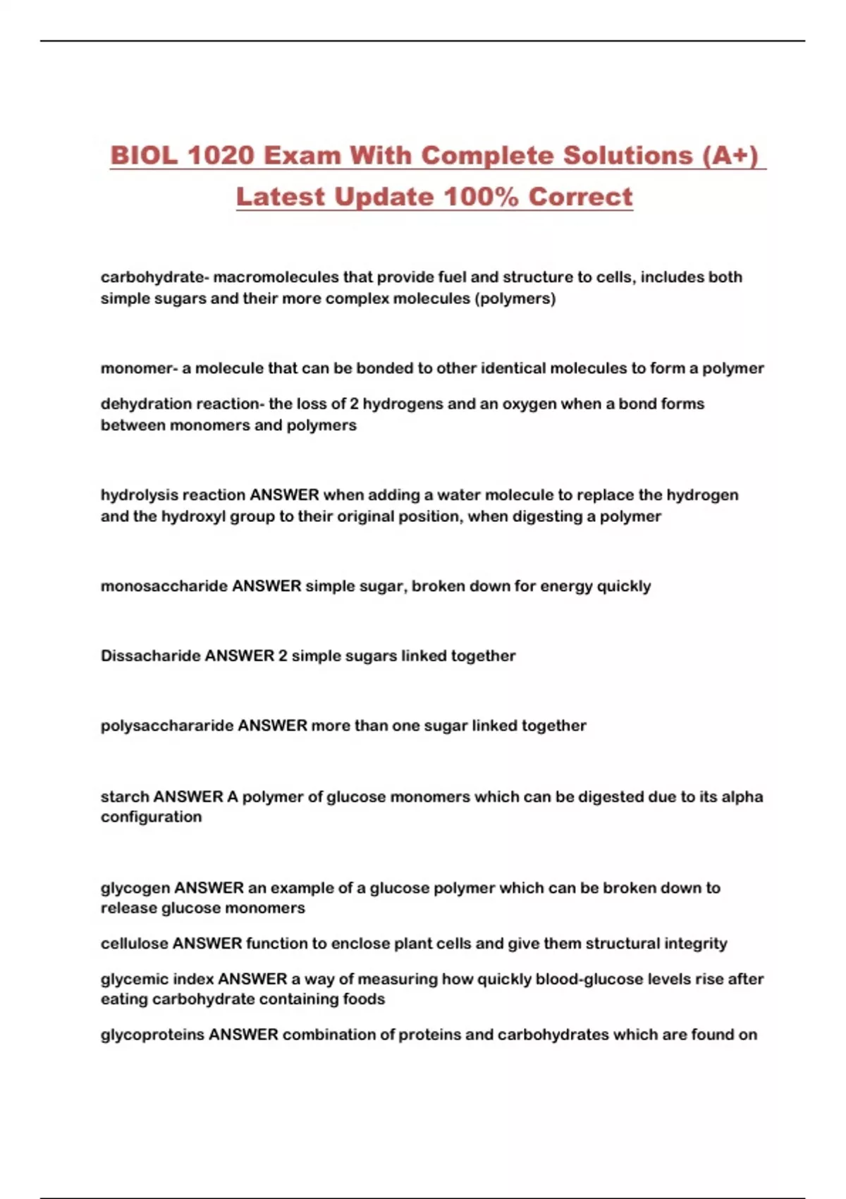 BIOL 1020 Exam With Complete Solutions (A+)