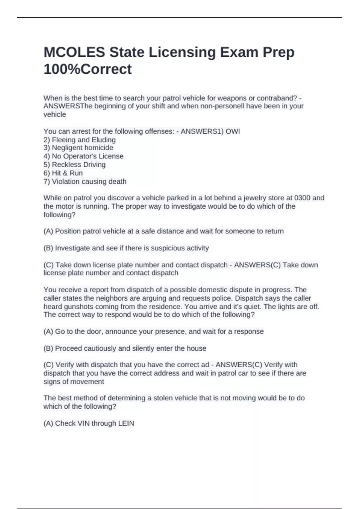 When is the best time to search your patrol vehicle for weapons or contraband? - ANSWERSThe beginning of your shift and when non-personell have been in your vehicle You can arrest for the following offenses: - ANSWERS1) OWI 2) Fleeing and Eluding 3) Negligent homicide 4) No Operator's License 5) Reckless Driving 6) Hit & Run 7) Violation causing death While on patrol you discover a vehicle parked in a lot behind a jewelry store at 0300 and the motor is running. The proper way to investigate would be to do which of the following? (A) Position patrol vehicle at a safe distance and wait for someone to return (B) Investigate and see if there is suspicious activity (C) Take down license plate number and contact dispatch - ANSWERS(C) Take down license plate number and contact dispatch You receive a report from dispatch of a possible domestic dispute in progress. The caller states the neighbors are arguing and requests police. Dispatch says the caller heard gunshots coming from the residence. You arrive and it's quiet. The lights are off. The correct way to respond would be to do which of the following? (A) Go to the door, announce your presence, and wait for a response (B) Proceed cautiously and silently enter the house (C) Verify with dispatch that you have the correct ad - ANSWERS(C) Verify with dispatch that you have the correct address and