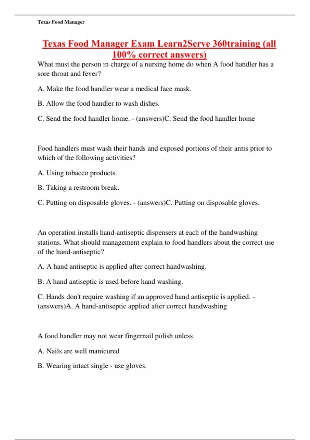 Texas Food Manager Exam Learn2Serve 360training (all