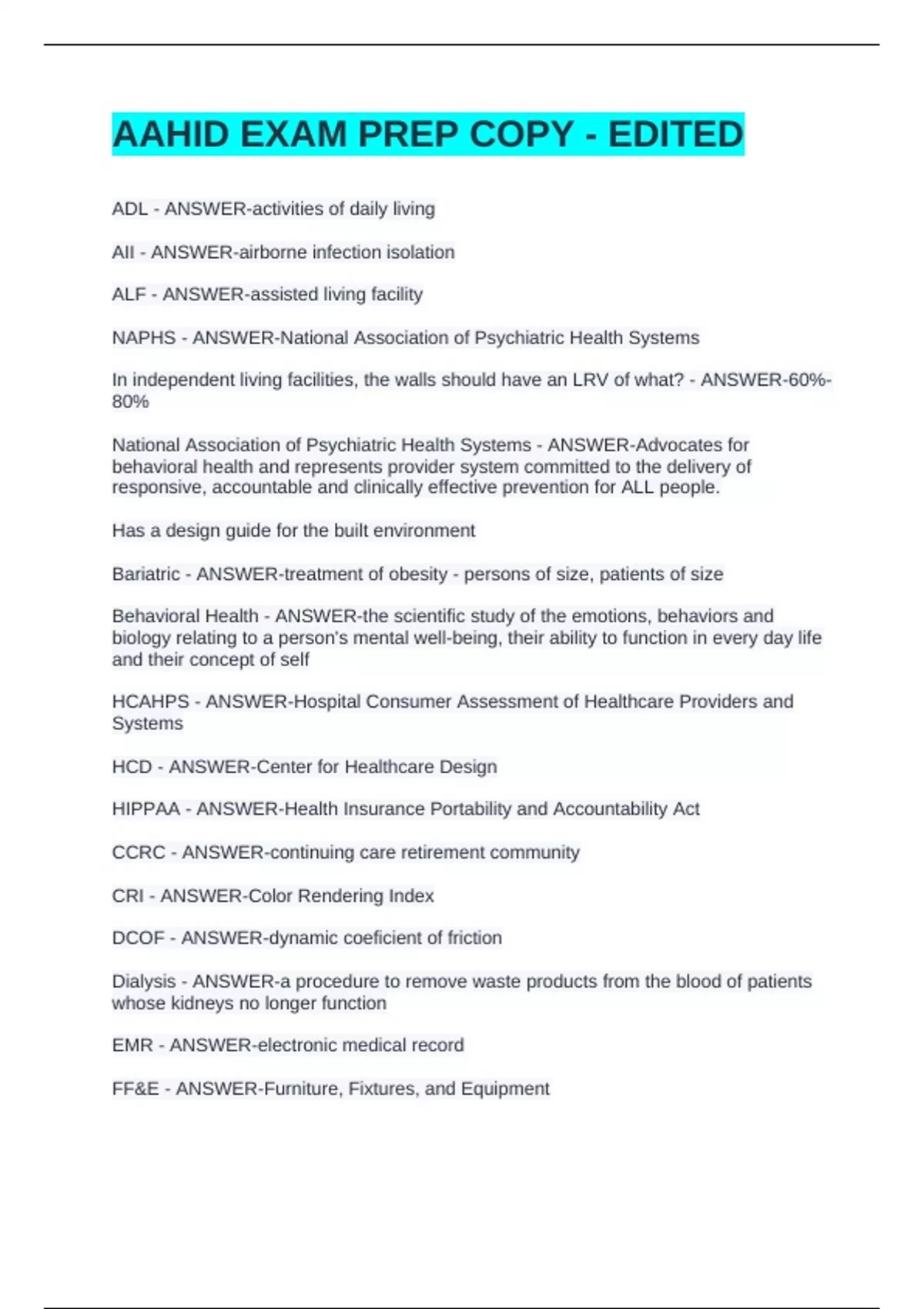 AAHID EXAM PREP COPY - EDITEDAAHID EXAM PREP COPY - EDITEDAAHID EXAM PREP COPY - EDITEDAAHID EXAM PREP COPY - EDITED ADL - ANSWER-activities of daily living AII - ANSWER-airborne infection isolation ALF - ANSWER-assisted living facility NAPHS - ANSWER-National Association of Psychiatric Health Systems In independent living facilities, the walls should have an LRV of what? - ANSWER-60%-80%