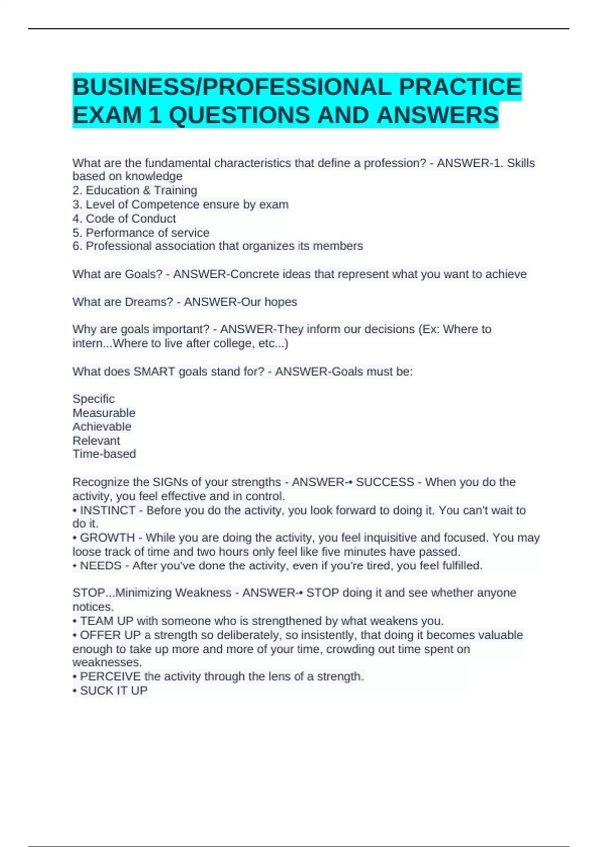 BUSINESS/PROFESSIONAL PRACTICE EXAM 1 QUESTIONS AND ANSWERSBUSINESS/PROFESSIONAL PRACTICE EXAM 1 QUESTIONS AND ANSWERSBUSINESS/PROFESSIONAL PRACTICE EXAM 1 QUESTIONS AND ANSWERS What are the fundamental characteristics that define a profession? - ANSWER-1. Skills based on knowledge 2. Education & Training 3. Level of Competence ensure by exam 4. Code of Conduct 5. Performance of service 6. Professional association that organizes its members What are Goals? - ANSWER-Concrete ideas that represent what you want to achieve What are Dreams? - ANSWER-Our hopes Why are goals important? - ANSWER-They inform our decisions (Ex: Where to intern...Where to live after college, etc...) What does SMART goals stand for? - ANSWER-Goals must be:
