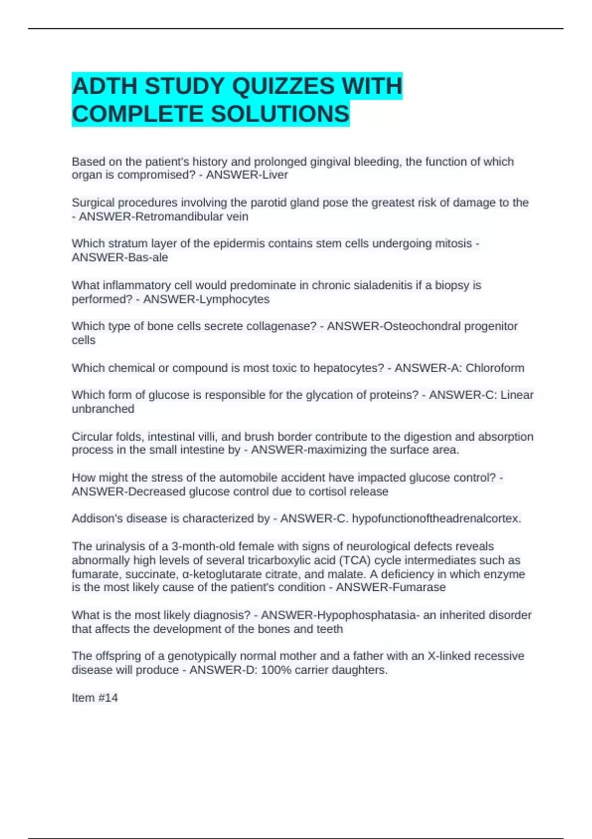 ADTH STUDY QUIZZES WITH COMPLETE SOLUTIONSADTH STUDY QUIZZES WITH COMPLETE SOLUTIONSBased on the patient's history and prolonged gingival bleeding, the function of which organ is compromised? - ANSWER-Liver Surgical procedures involving the parotid gland pose the greatest risk of damage to the - ANSWER-Retromandibular vein Which stratum layer of the epidermis contains stem cells undergoing mitosis - ANSWER-Bas-ale What inflammatory cell would predominate in chronic sialadenitis if a biopsy is performed? - ANSWER-Lymphocytes Which type of bone cells secrete collagenase? - ANSWER-Osteochondral progenitor cells