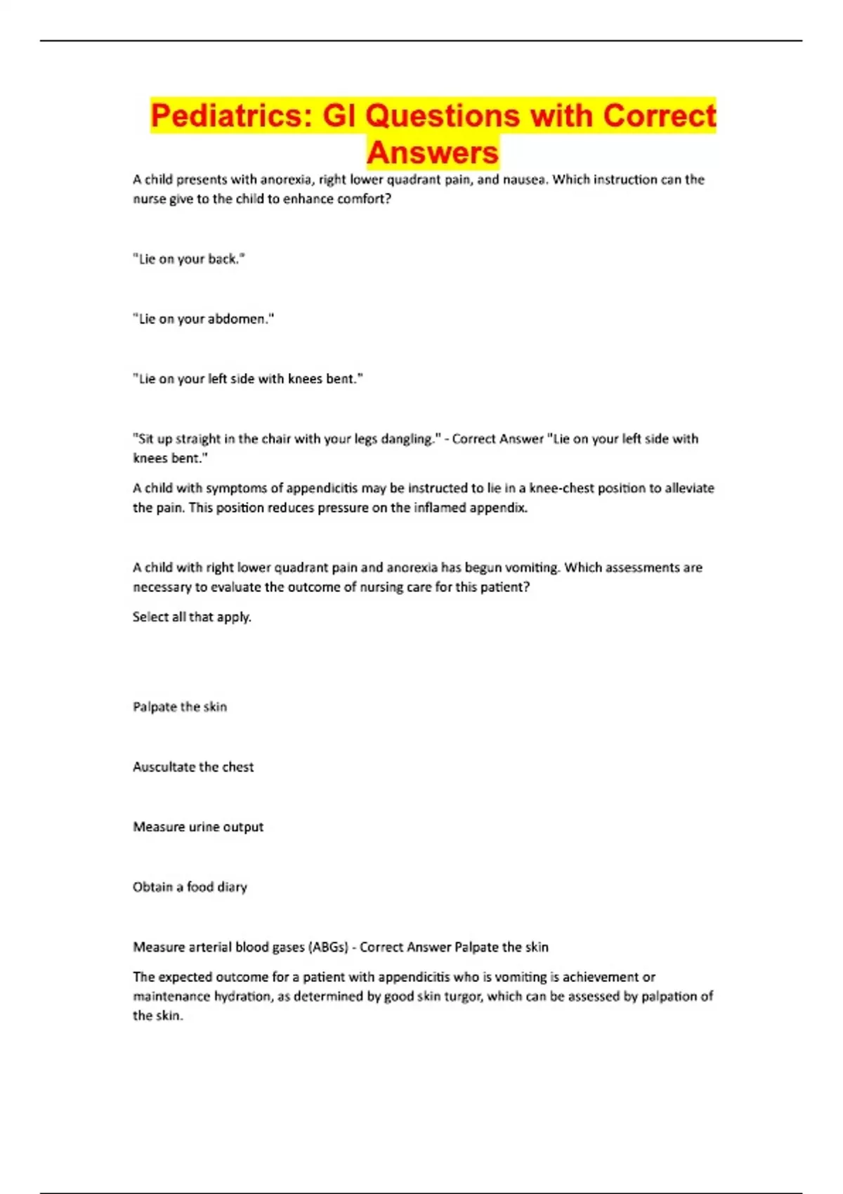 A child presents with anorexia, right lower quadrant pain, and nausea. Which instruction can the nurse give to the child to enhance comfort? "Lie on your back." "Lie on your abdomen." "Lie on your left side with knees bent." "Sit up straight in the chair with your legs dangling." - Correct Answer "Lie on your left side with knees bent." A child with symptoms of appendicitis may be instructed to lie in a knee-chest position to alleviate the pain. This position reduces pressure on the inflamed appendix. A child with right lower quadrant pain and anorexia has begun vomiting. Which assessments are necessary to evaluate the outcome of nursing care for this patient? Select all that apply. Palpate the skin Auscultate the chest Measure urine output Obtain a food diary Measure arterial blood gases (ABGs) - Correct Answer Palpate the skin The expected outcome for a patient with appendicitis who is vomiting is achievement or maintenance hydration, as determined by good skin turgor, which can be assessed by palpation of the skin.