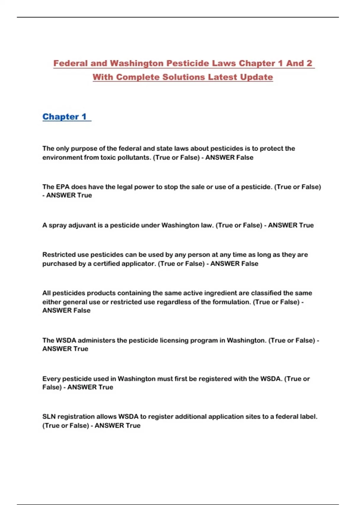 A spray adjuvant is a pesticide under Washington law. (True or False) - ANSWER True