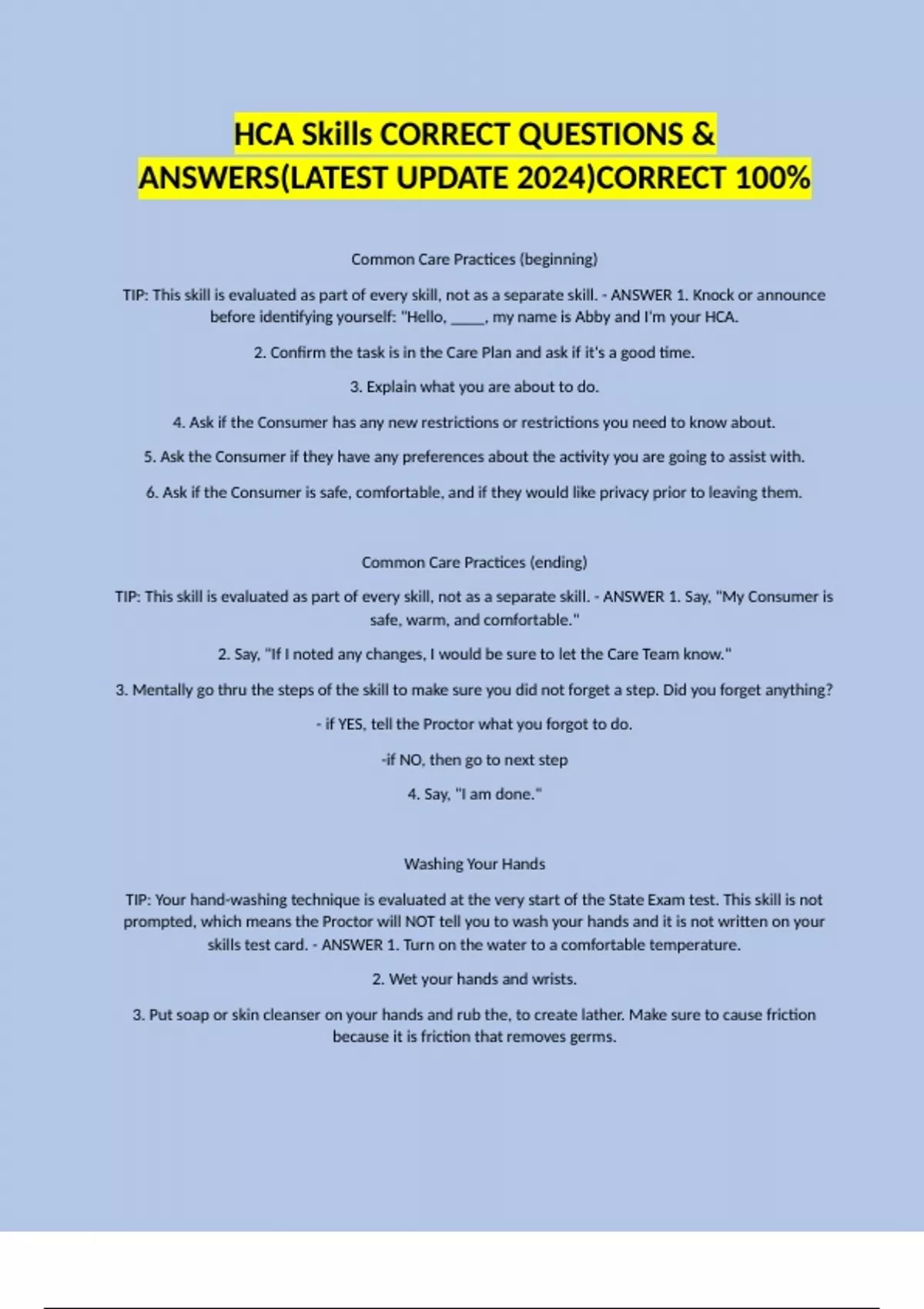 Common Care Practices (beginning) TIP: This skill is evaluated as part of every skill, not as a separate skill. - ANSWER 1. Knock or announce before identifying yourself: "Hello, ____, my name is Abby and I'm your HCA. 2. Confirm the task is in the Care Plan and ask if it's a good time. 3. Explain what you are about to do. 4. Ask if the Consumer has any new restrictions or restrictions you need to know about. 5. Ask the Consumer if they have any preferences about the activity you are going to assist with. 6. Ask if the Consumer is safe, comfortable, and if they would like privacy prior to leaving them. Common Care Practices (ending) TIP: This skill is evaluated as part of every skill, not as a separate skill. - ANSWER 1. Say, "My Consumer is safe, warm, and comfortable." 2. Say, "If I noted any changes, I would be sure to let the Care Team know." 3. Mentally go thru the steps of the skill to make sure you did not forget a step. Did you forget anything? - if YES, tell the Proctor what you forgot to do. -if NO, then go to next step 4. Say, "I am done." Washing Your Hands